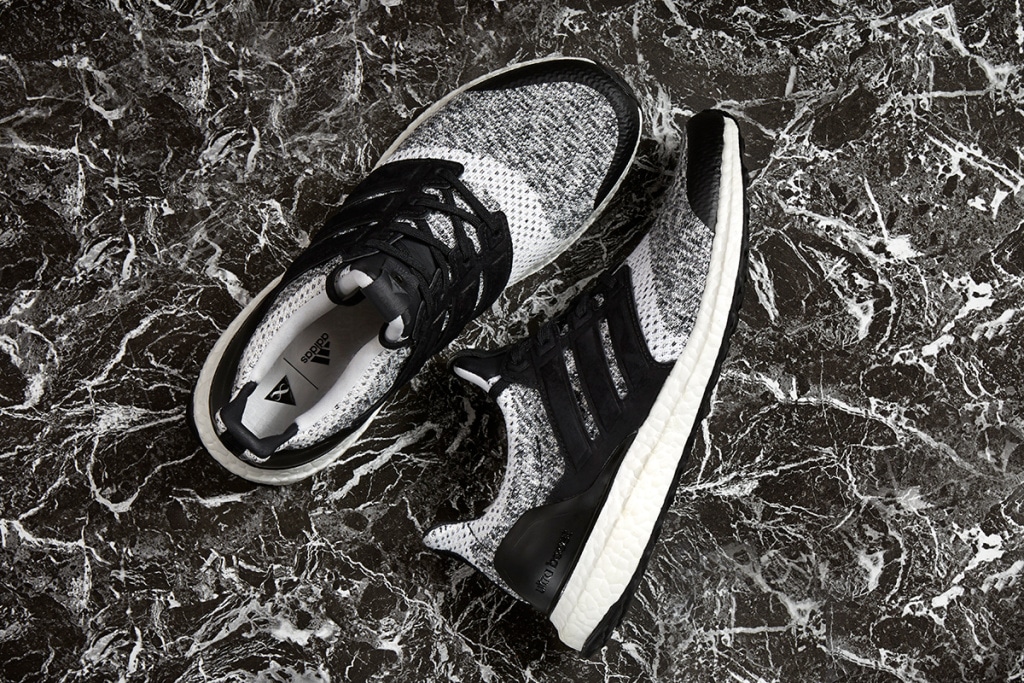 Ta kolaboracja ma dwóch bohaterów. Pierwszym z nich jest model Ultra Boost w bardzo ciekawej stylistyce. Cholewka wykonana z przędzy Primeknit zostaje zabarwiona przy pomocy koloru szarego oraz białego. Ciekawostkami są tu akcenty, które odpowiadają za cały efekt końcowy, która powala. Mowa tu o skórzanym języku w czerni, a także równie czarnych trzech paskach po boku, które mamy w delikatnym zamszu. Do tego dochodzi czarny stabilizator pięty oraz termozgrzewalna ochrona na toeboxie.