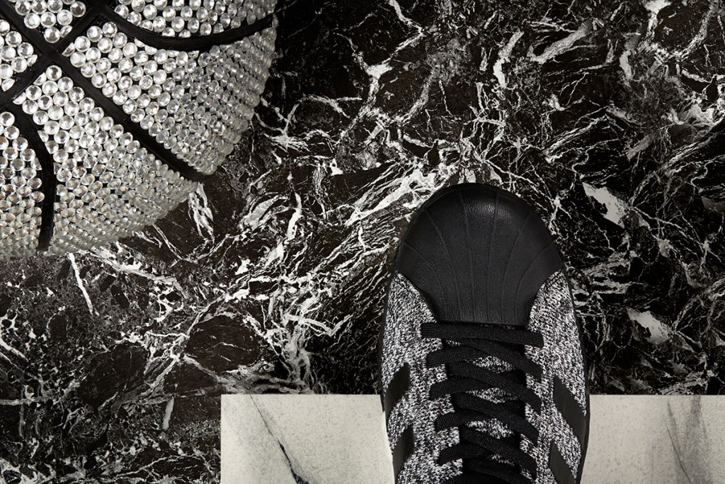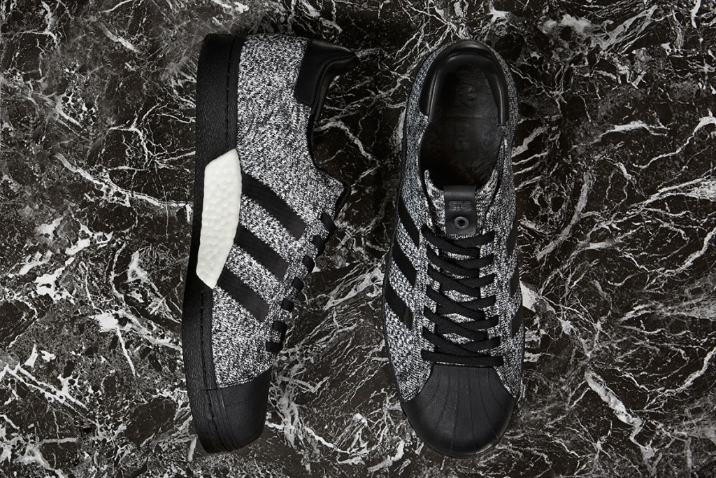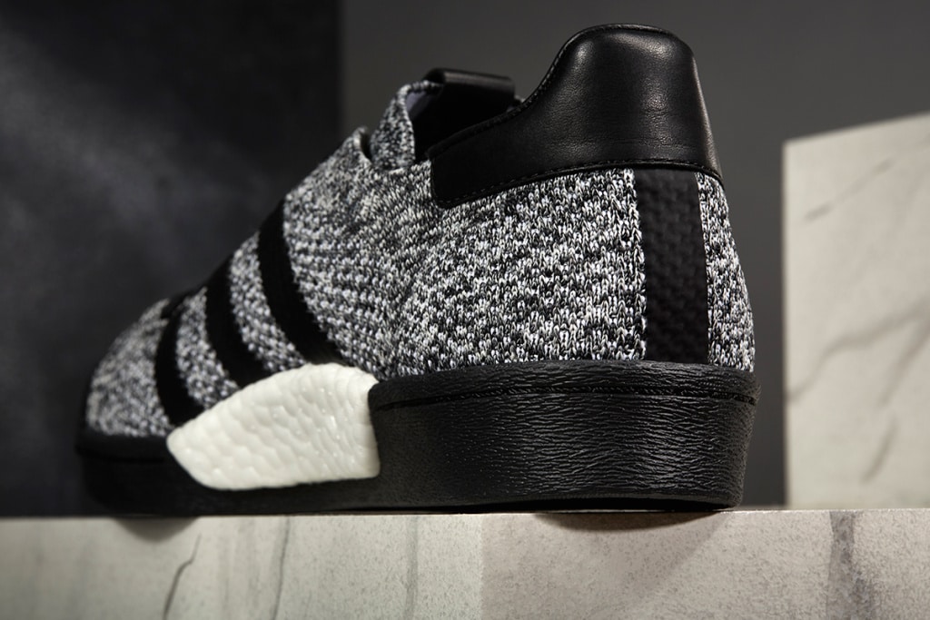 Drugim jest model adidas Superstar, który również wykorzystuje biało szarą przędzę Primeknit. Ten model dopieszczono czarną skórzaną zapiętką, a także czarnymi trzema paskami na boku, czarną muszulą na przodzie oraz podeszwą w tym samym kolorze. Tu elementem charakterystycznym jest Boost od wewnętrznej strony podeszwy.