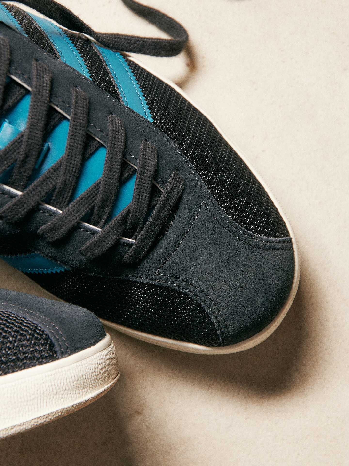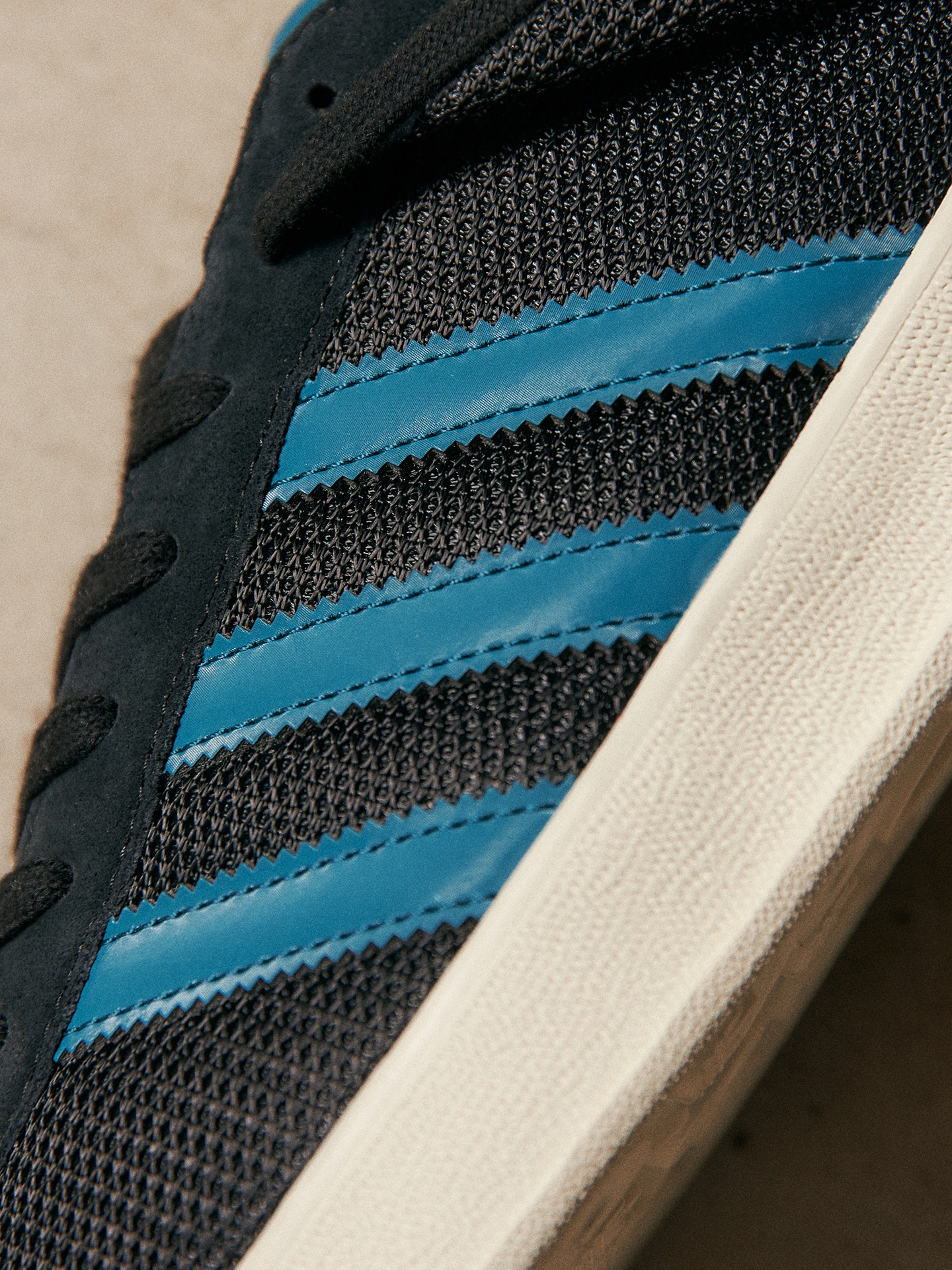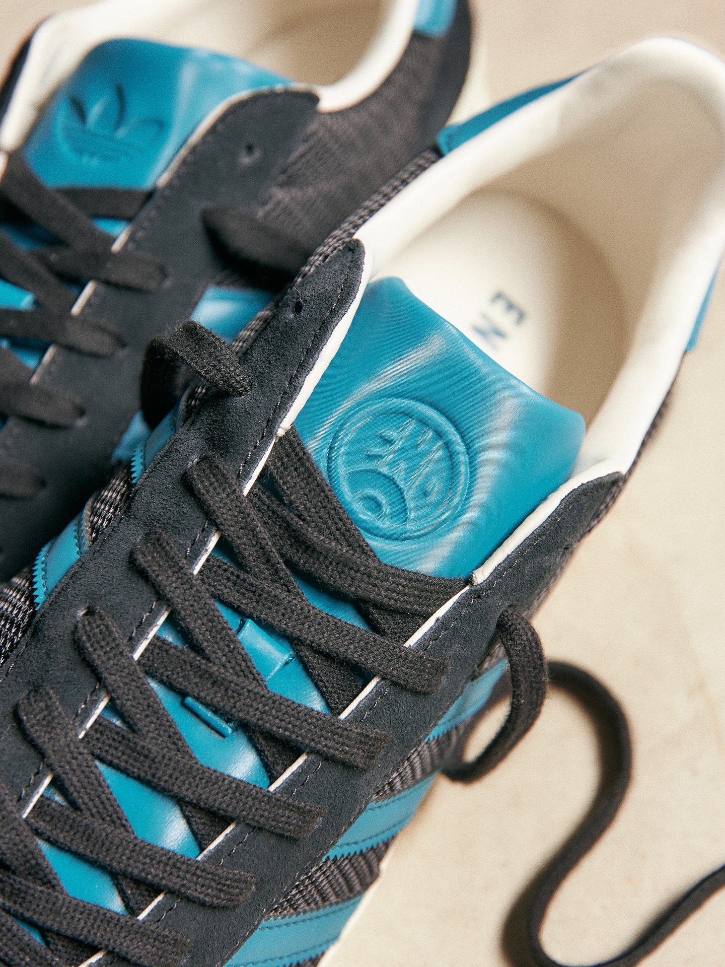 Kapsuła obejmuje cztery elementy, z których gwiazdą jest Gazelle Indoor Pro w odcieniach czerni, bieli i turkusu — barwach macierzystego miasta END. But zachowuje klasyczną sylwetkę, ale zyskał współczesny twist dzięki siateczkowej cholewce i personalizowanym detalom. Logo END. i adidas pojawia się na języku, pięcie i wkładce, a trzy turkusowe paski dopełniają całość.