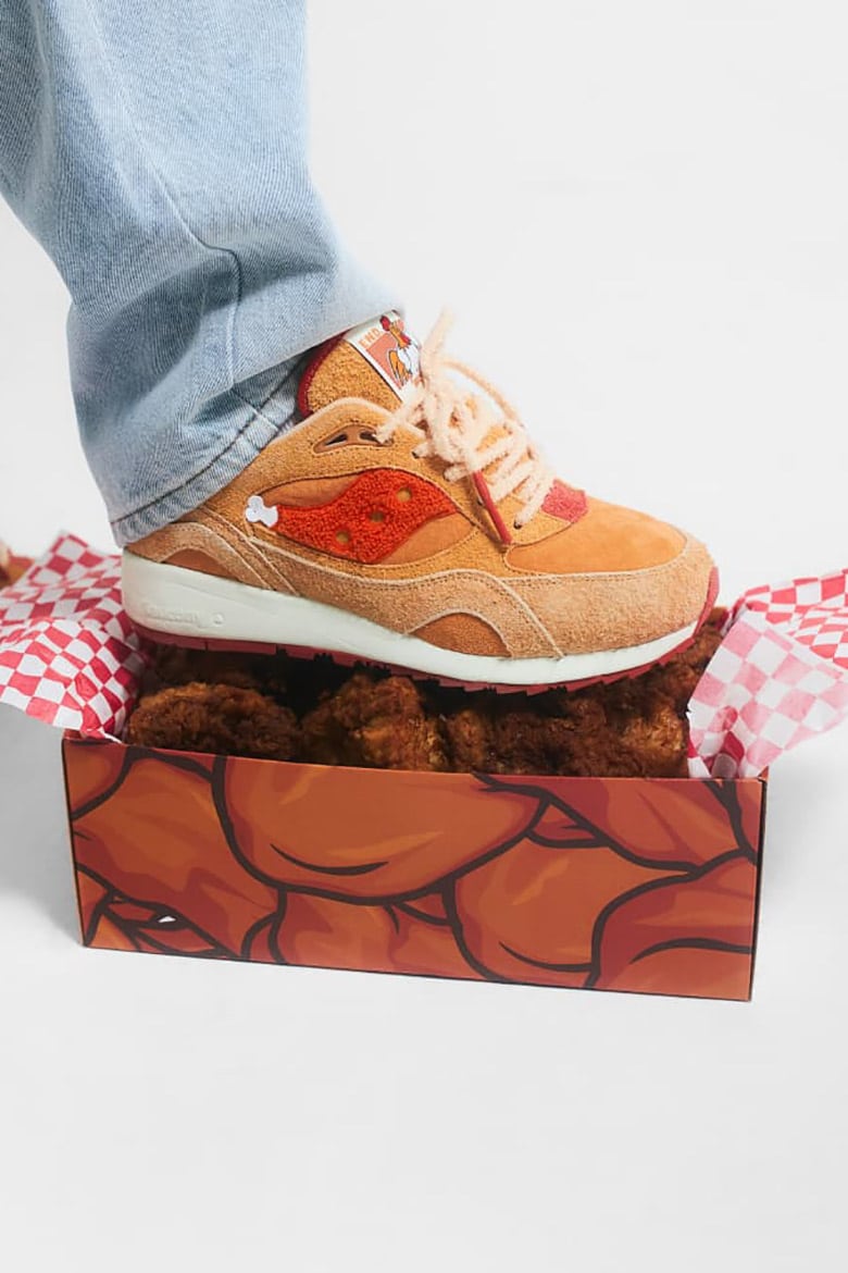 Kontynuując fast foodowe odniesienia, branding butów otrzymuje metamorfozę inspirowaną smażonym kurczakiem. Zerknijcie na logo Saucony „S” na ściance bocznej, które zostało wykonane z czerwonej tkaniny szenilowej i wykończone małą, przypominającą kość aplikacją! Kropką nad i wydaje się być kreskówkowy kurczak umieszczony na metce na języku. Natomiast włochate sznurówki w beżowym odcieniu nawiązują do smażenia na głębokim oleju.