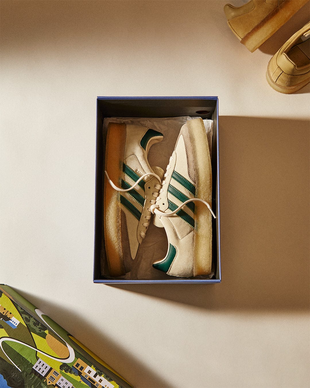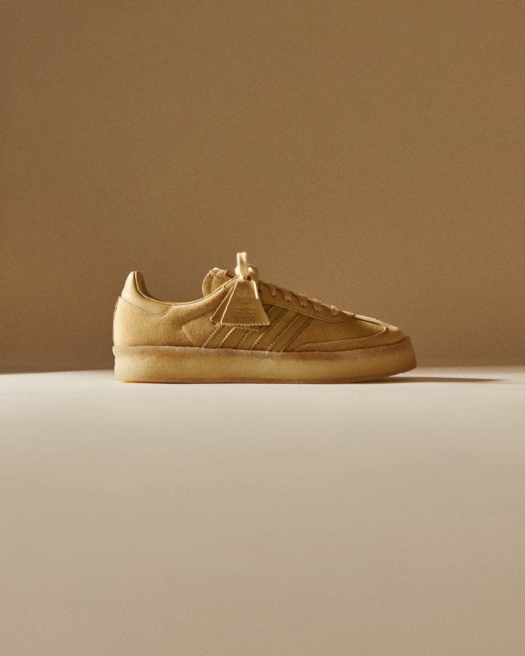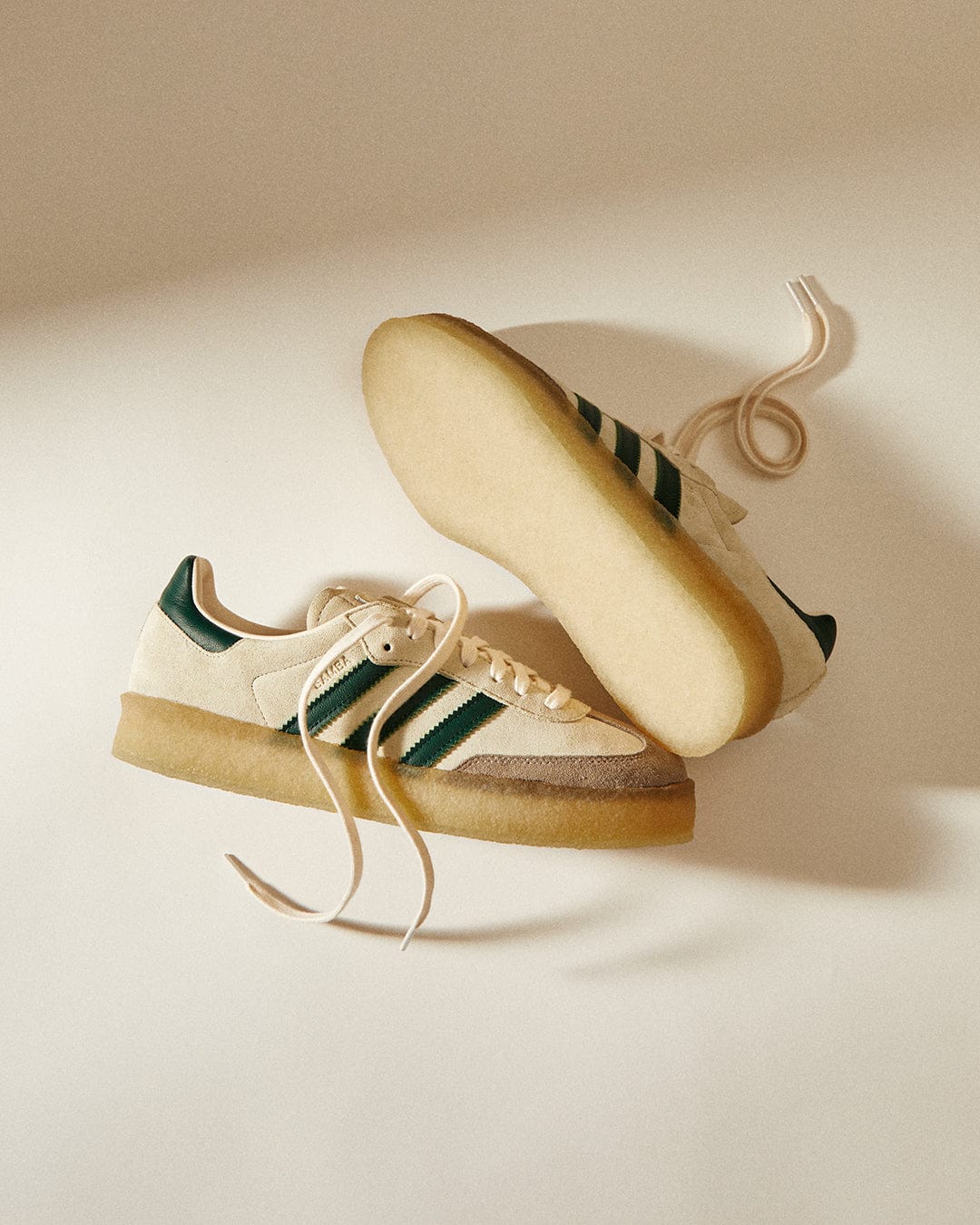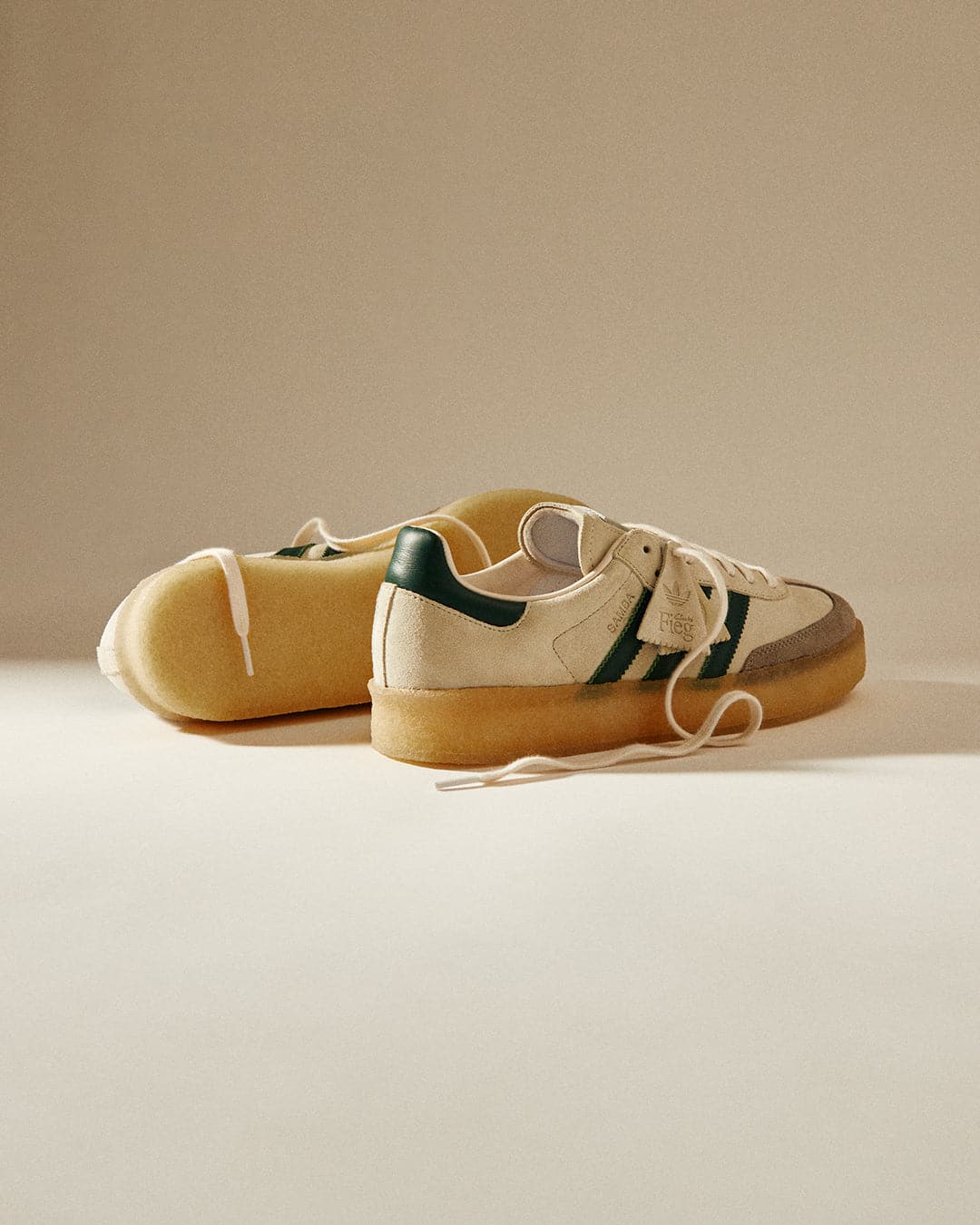 Cholewka składa się z klasycznej sylwetki adidas Samba, odtworzonej na nowo z charakterystycznym zamszem Clark’s Originals — z trzema paskami po bokach. Projekt dopełnia kultowa krepowana podeszwa zewnętrzna Clarks, co oznacza, że po raz pierwszy ta podeszwa jest połączona z cholewką adidas Samba. Wreszcie oferta obejmuje niestandardowe breloki i przemyślane opakowania. Do wyboru mamy wersję w kolorze kremowym, miodowym oraz zielonym.