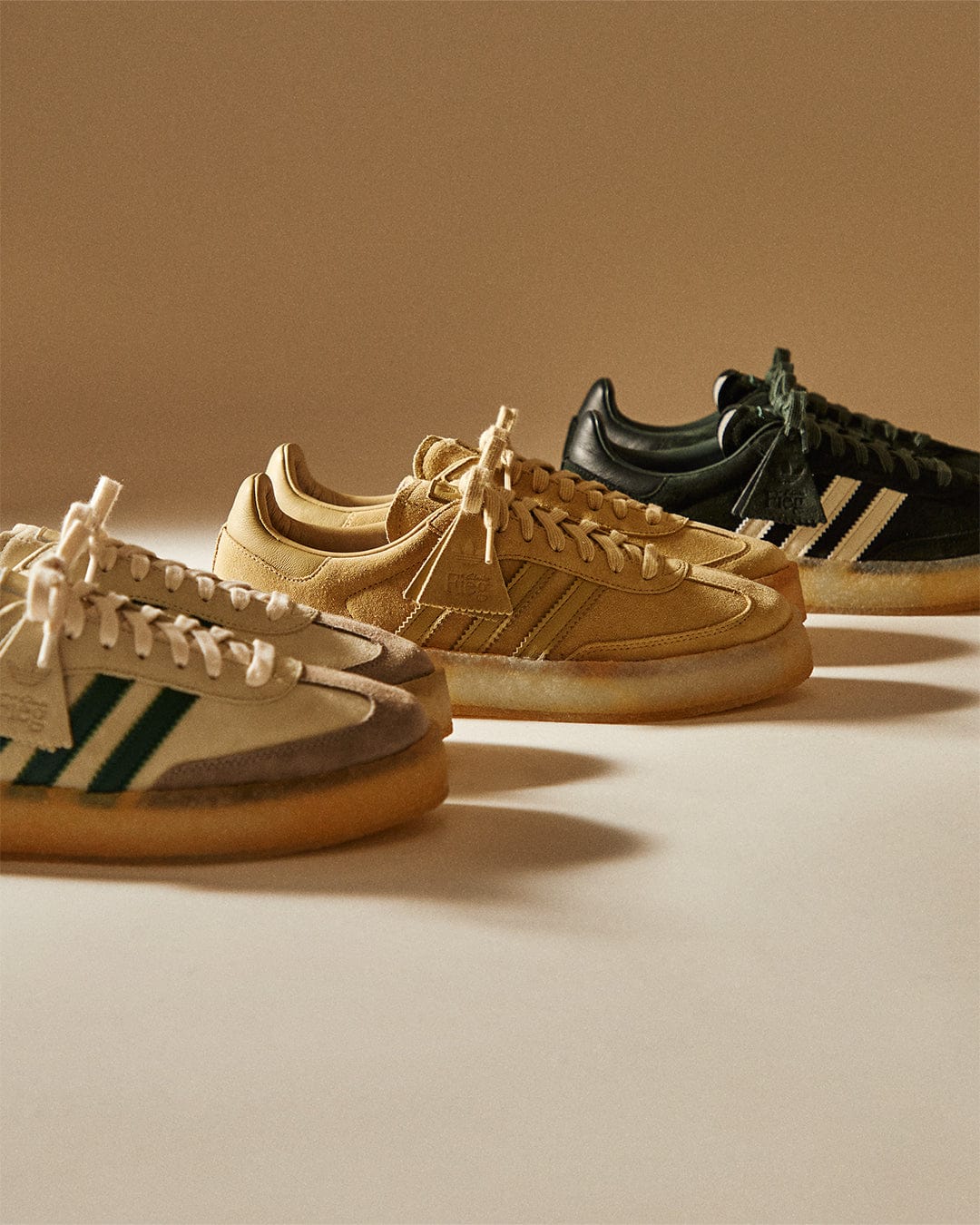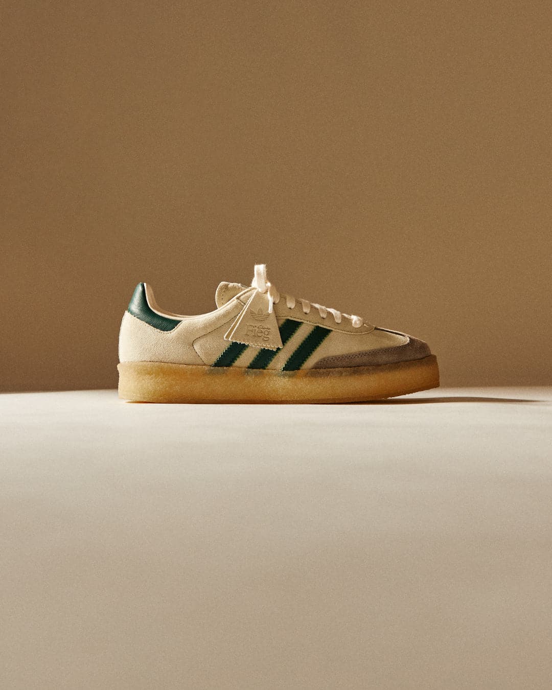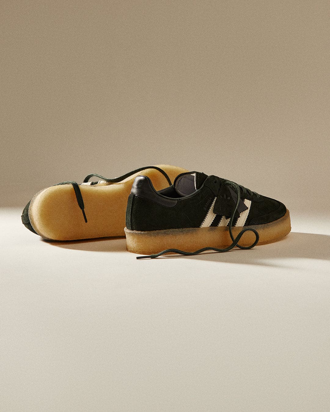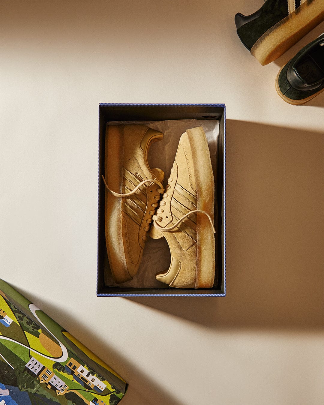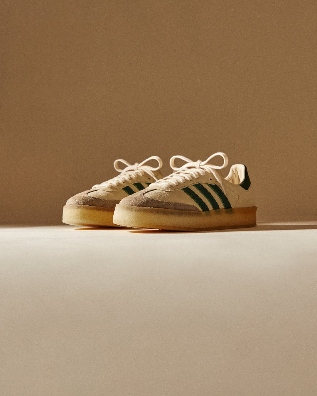 Cholewka składa się z klasycznej sylwetki adidas Samba, odtworzonej na nowo z charakterystycznym zamszem Clark’s Originals — z trzema paskami po bokach. Projekt dopełnia kultowa krepowana podeszwa zewnętrzna Clarks, co oznacza, że po raz pierwszy ta podeszwa jest połączona z cholewką adidas Samba. Wreszcie oferta obejmuje niestandardowe breloki i przemyślane opakowania. Do wyboru mamy wersję w kolorze kremowym, miodowym oraz zielonym.