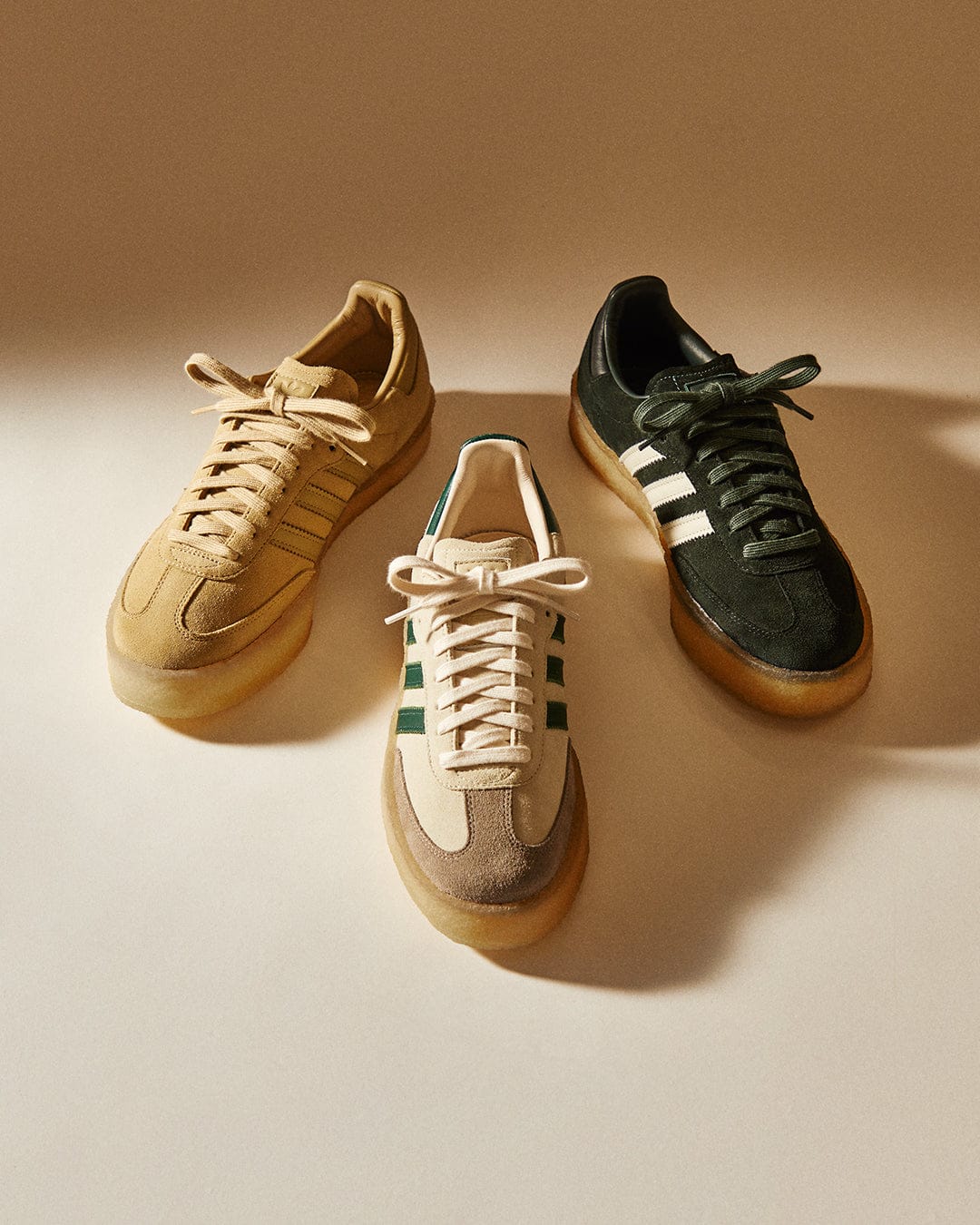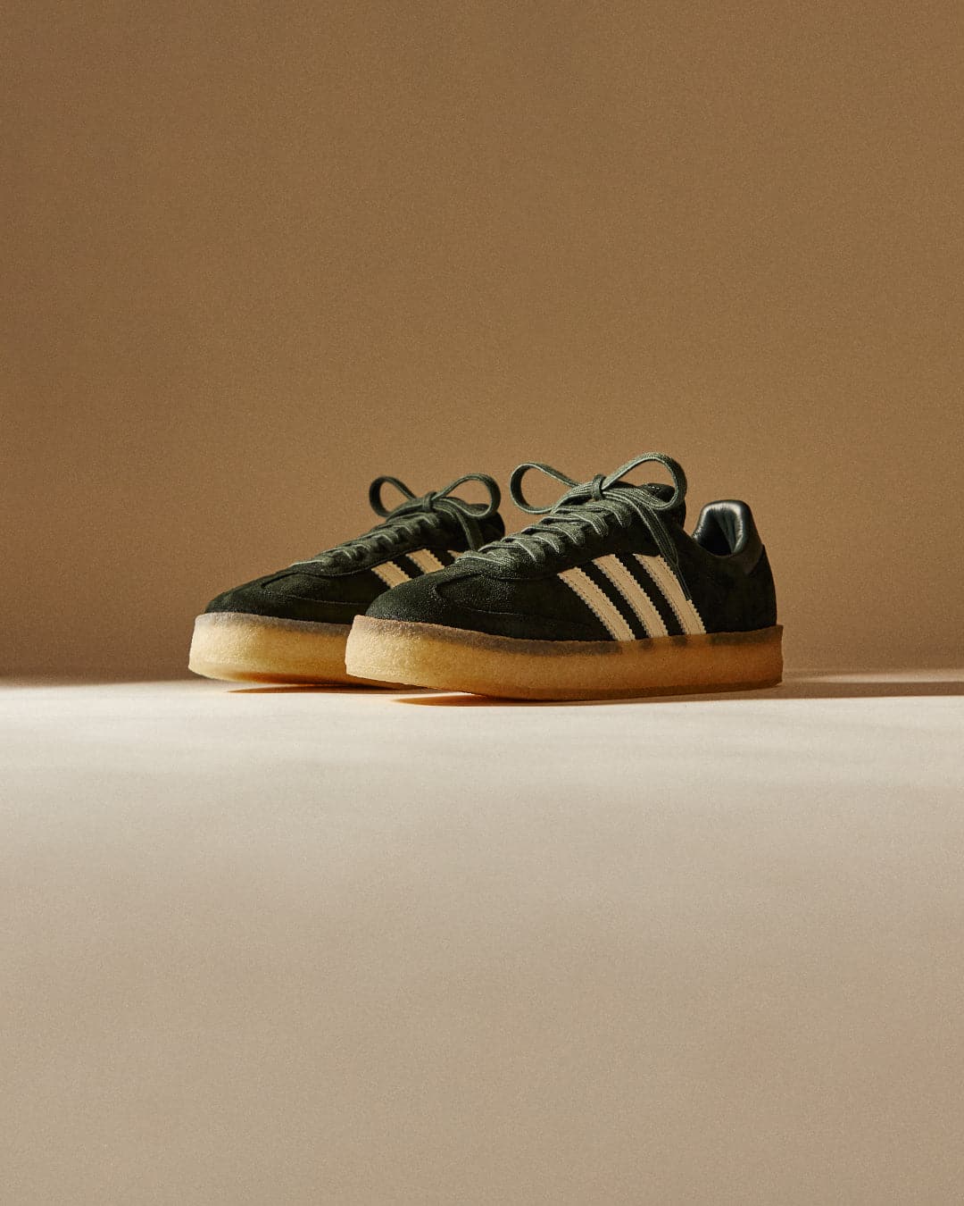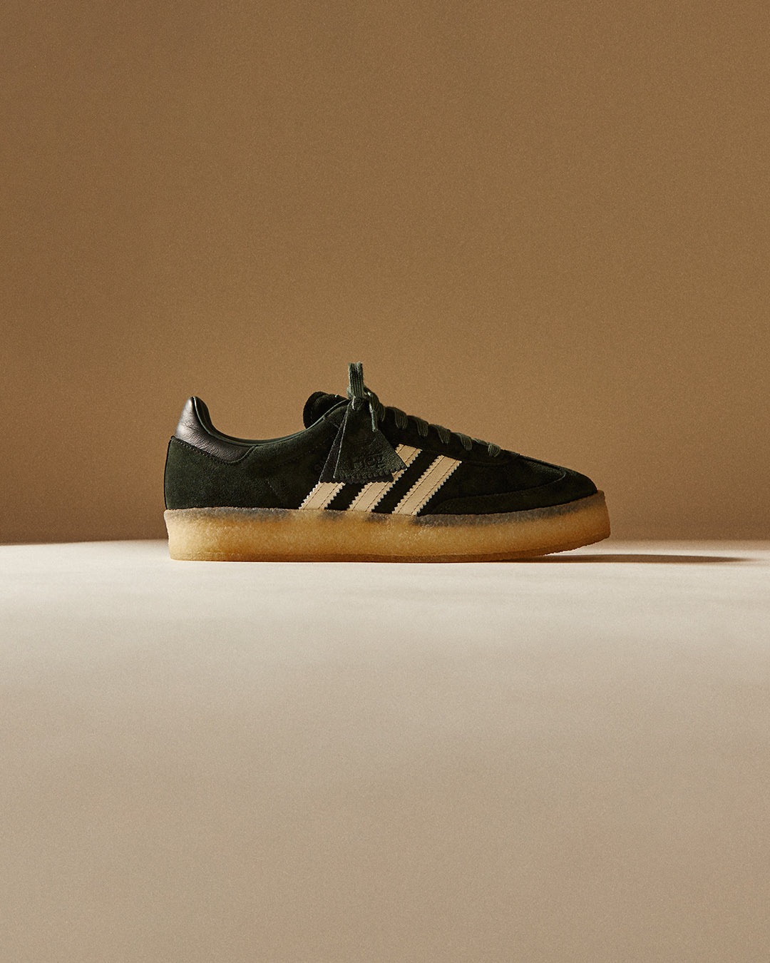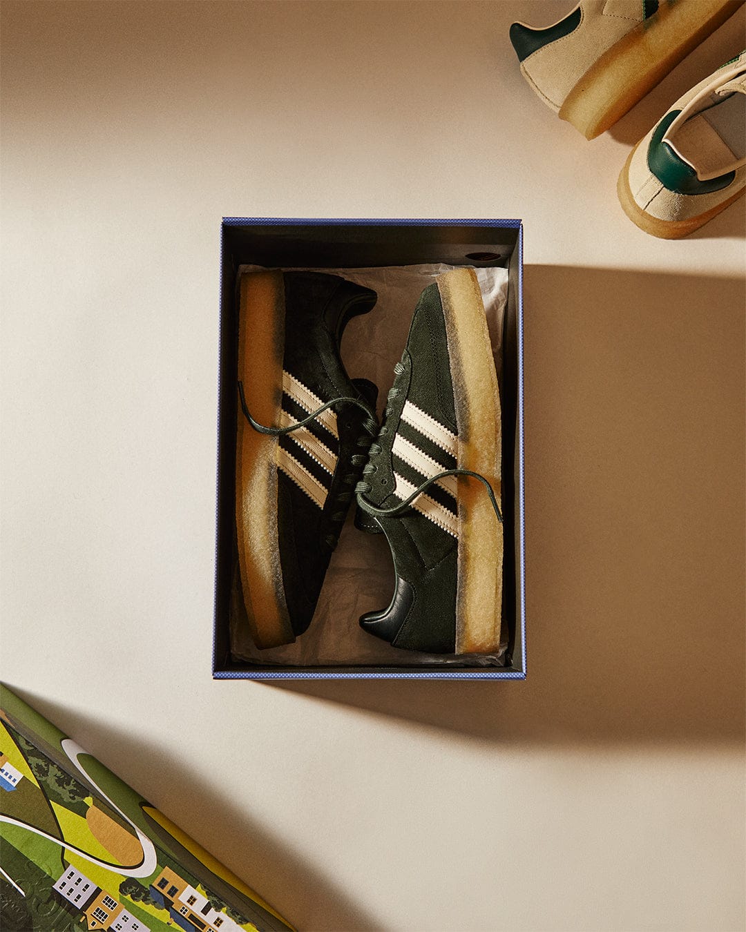 Cholewka składa się z klasycznej sylwetki adidas Samba, odtworzonej na nowo z charakterystycznym zamszem Clark’s Originals — z trzema paskami po bokach. Projekt dopełnia kultowa krepowana podeszwa zewnętrzna Clarks, co oznacza, że po raz pierwszy ta podeszwa jest połączona z cholewką adidas Samba. Wreszcie oferta obejmuje niestandardowe breloki i przemyślane opakowania. Do wyboru mamy wersję w kolorze kremowym, miodowym oraz zielonym.