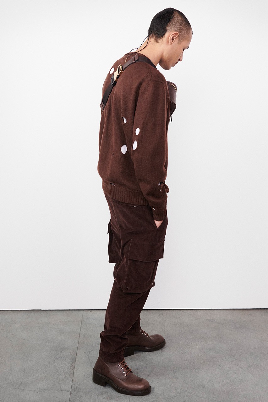 Przechodząc do samej kolekcji to widzimy sporo spodni bojówek z kieszeniami po bokach nogawek. Obok tego w oczy rzucają się długie togi sięgające aż do samych kostek. Jednak najważniejsza jest tu odzież wierzchnia. Ciekawym rozwiązaniem jest tu chociażby narzucenie kardiganów na krótkie płaszcze, którym towarzyszą kurtki z powycinanymi literami oraz wojskowa parka. Niemalże wszystkie stylizacje dopełniono butami w outdoorowej stylistyce co tylko podkreśla klimat całej kolekcji.