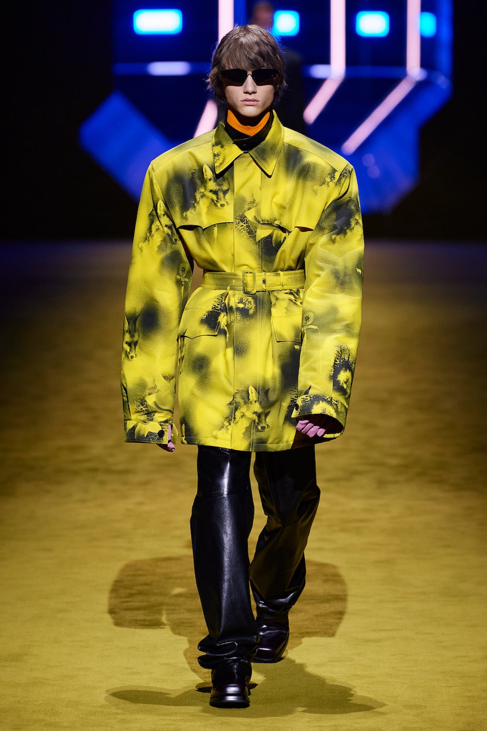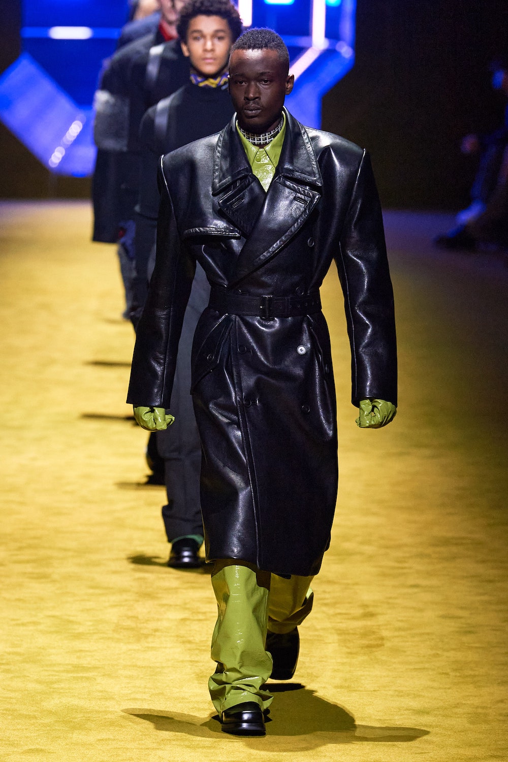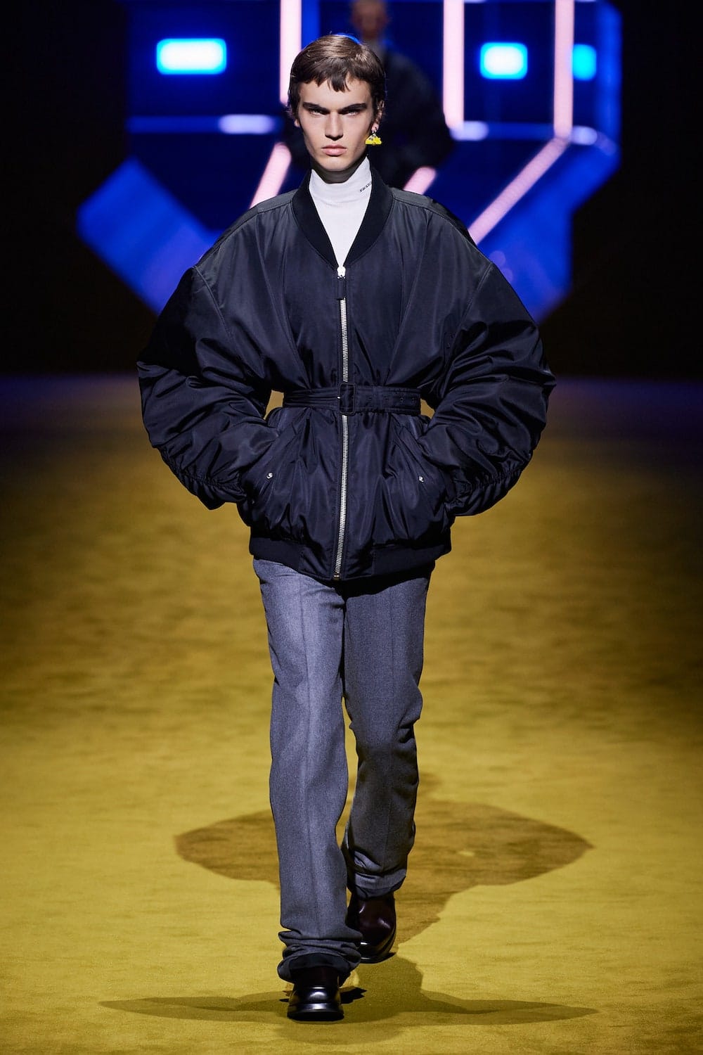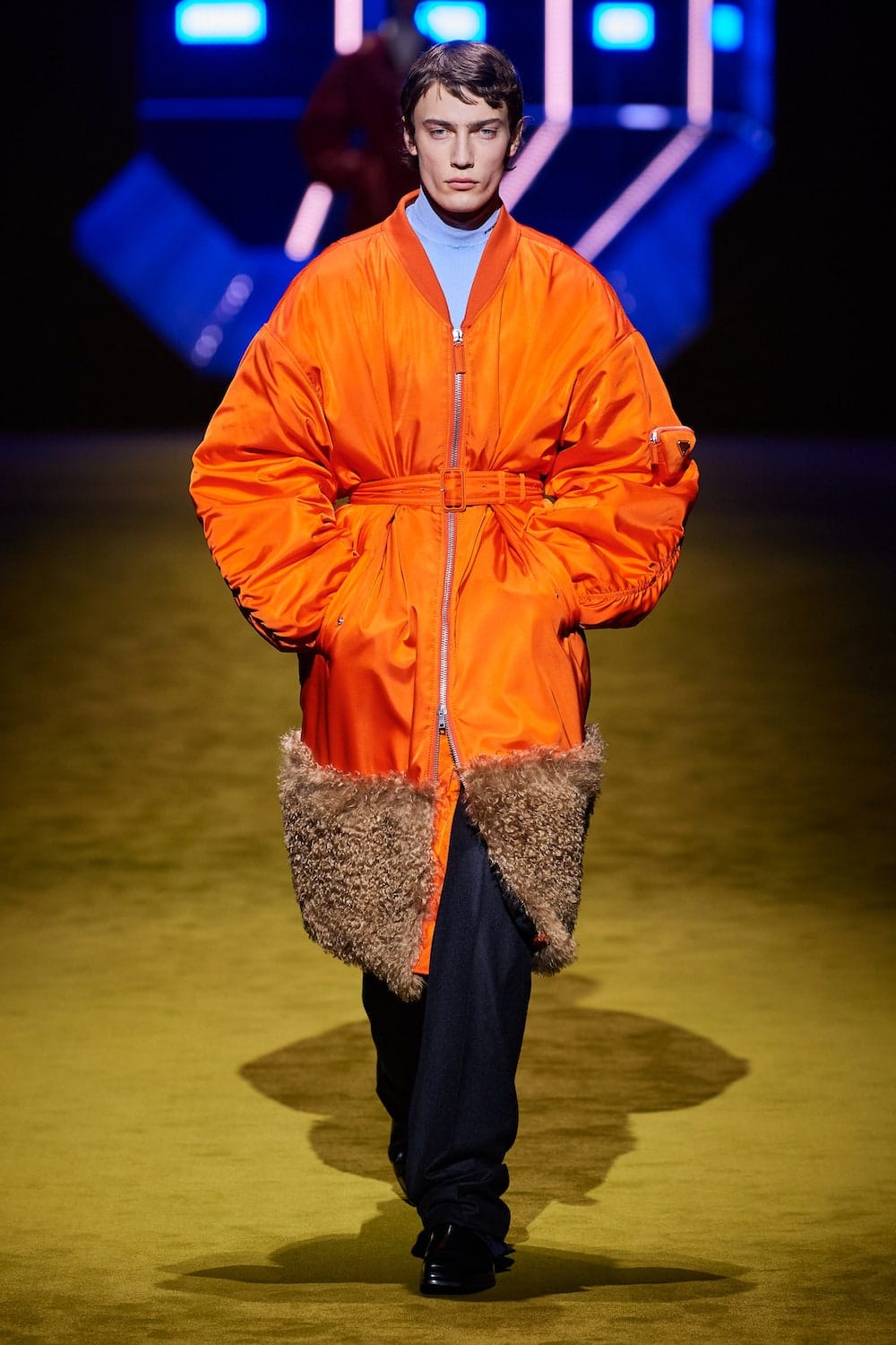 Zatem po takim oświadczeniu nie dziwi nas obecność chociażby kombinezonów czy obszernych płaszczy, które mogą się kojarzyć z tymi, które nosili kiedyś prezesi fabryk. To co jeszcze wyróżnia tę kolekcję to kroje z szerokimi ramionami i sporych rozmiarów rękawy (zerknijcie na marynarki oraz kurtki wojskowe MA-1, tzw. bomberki). Warto również zwrócić uwagę na spodnie, które są zdecydowanie dłuższe niż to co widywaliśmy w ostatnich latach, przez co nogawki tworzą warstwy spoczywając na butach. Innym ciekawym rozwiązaniem są futerkowe wykończenia u dołu płaszczy lub na ich rękawach w okolicach łokcia.