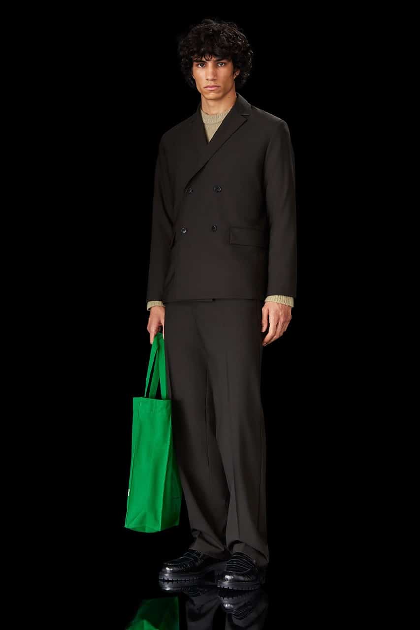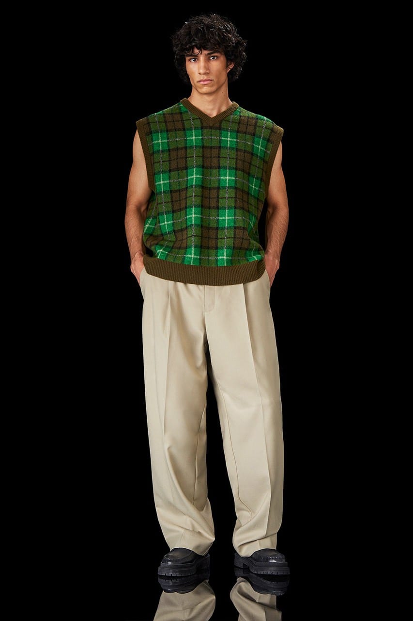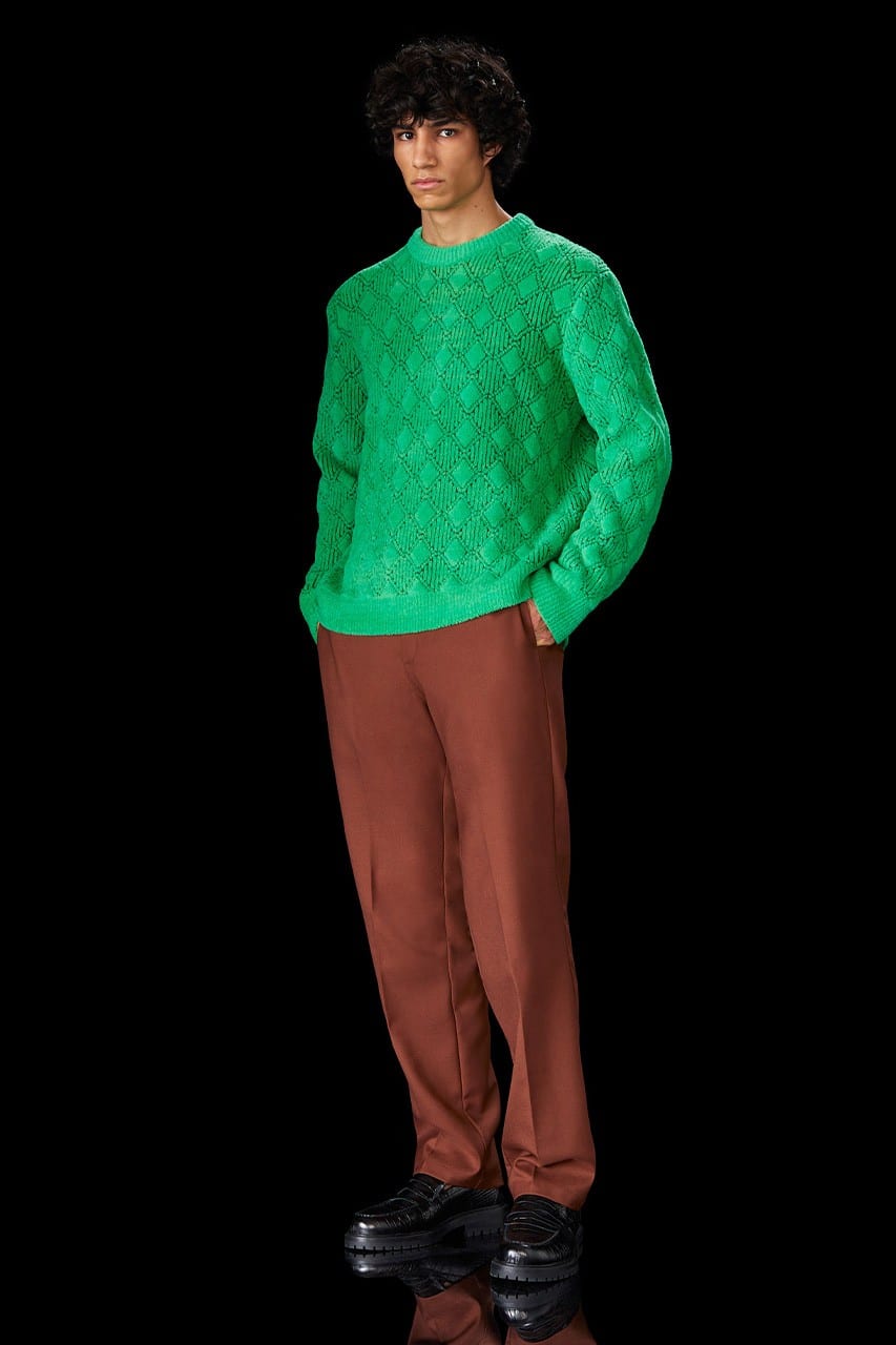 Pośród nowości znajdzie szereg luźnych krojów i przerysowanych sylwetek. To co wychodzi przed szereg to propozycje w kolorze zielonym, który tak bardzo rozpowszechniła Bottega Veneta. Towarzyszą temu wzory w kratę oraz dzianiny z grubymi warkoczami. Obok tego zaprezentowano również szereg propozycji wykonanych ze skóry oraz dość luźne spodnie z prostymi nogawkami, które rolują się na butach.