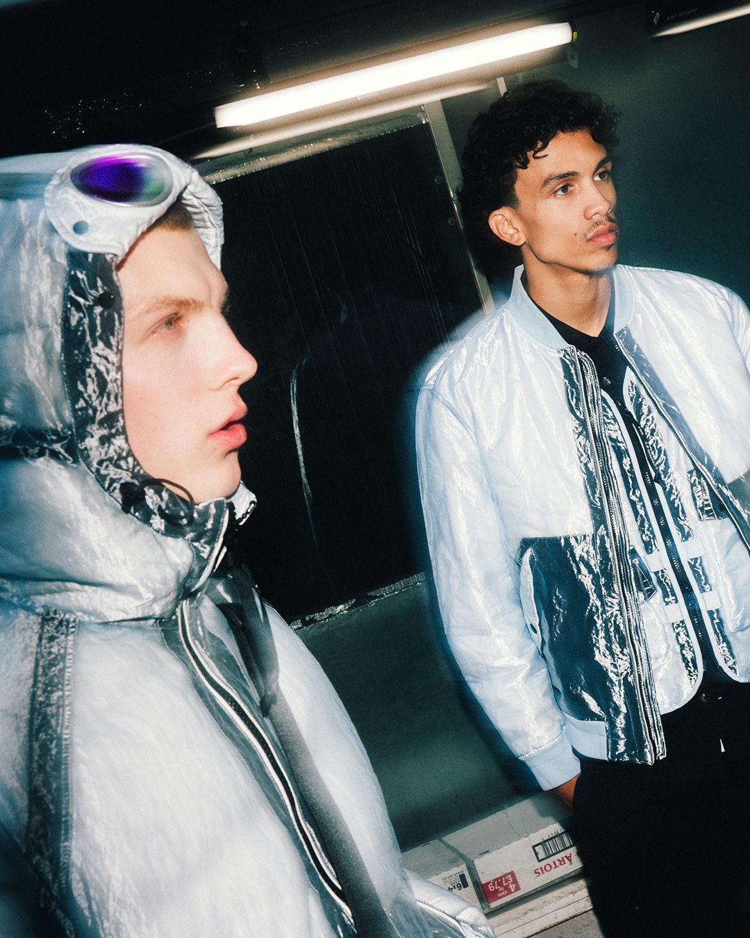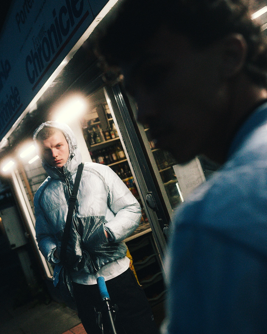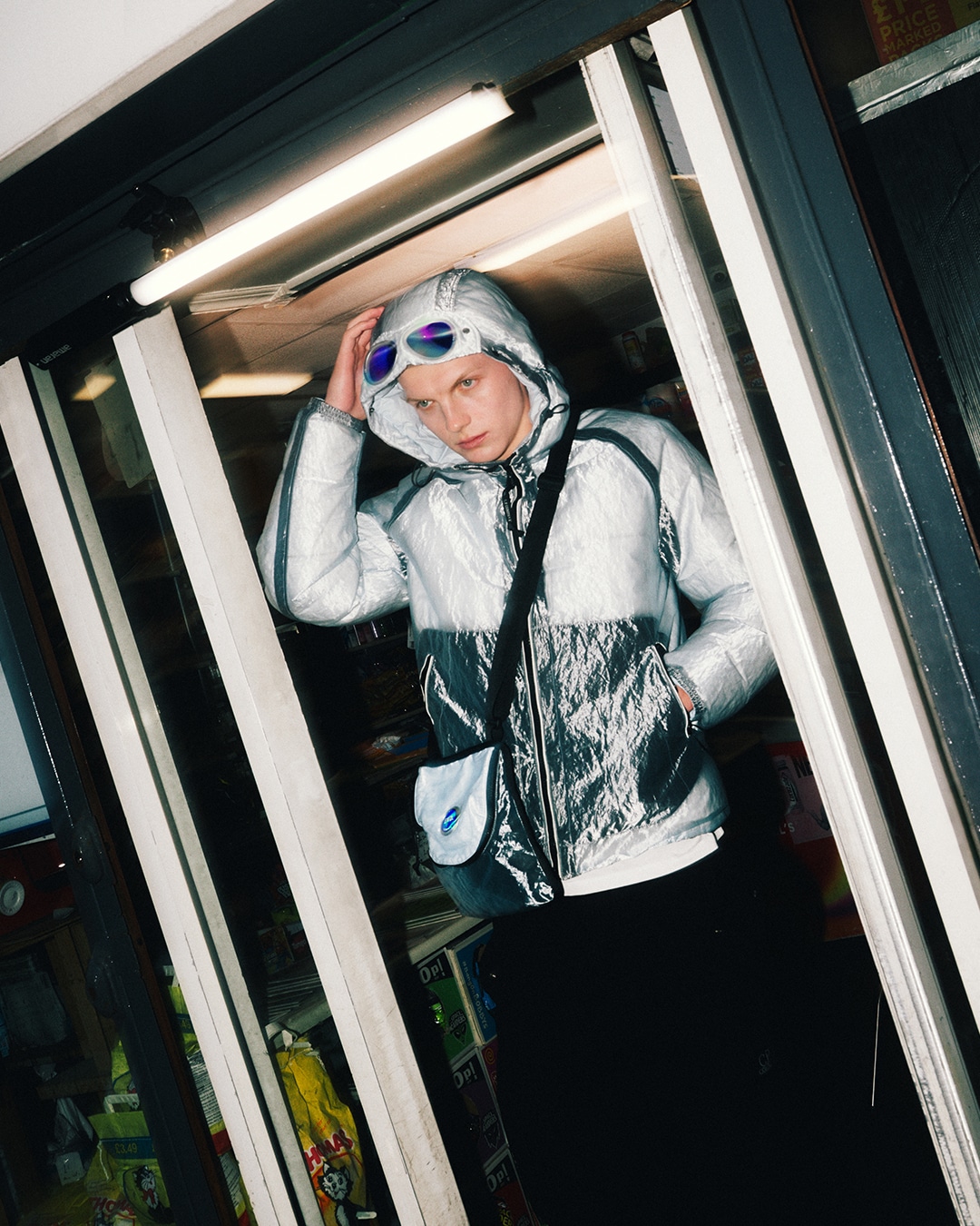 Kapsuła składa się z czterech kultowych sylwetek: Goggle Puffer, Technical Vest, Bomber Jacket i Shoulder Bag. Wszystko w opalizującym, lodowobłękitnym odcieniu, który przywołuje światło neonów rozświetlających miejskie zakamarki. Największą gwiazdą jest nowa tkanina Kan-D – półprzezroczysty nylon o błyszczącym, celofanowym wykończeniu, który odsłania wewnętrzną konstrukcję ubrań i celebruje kunszt ich wykonania.