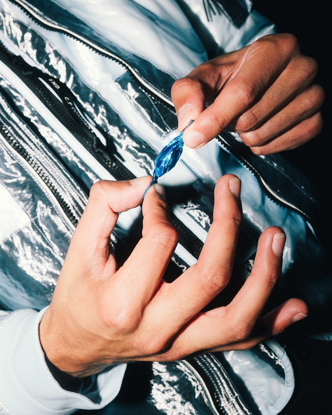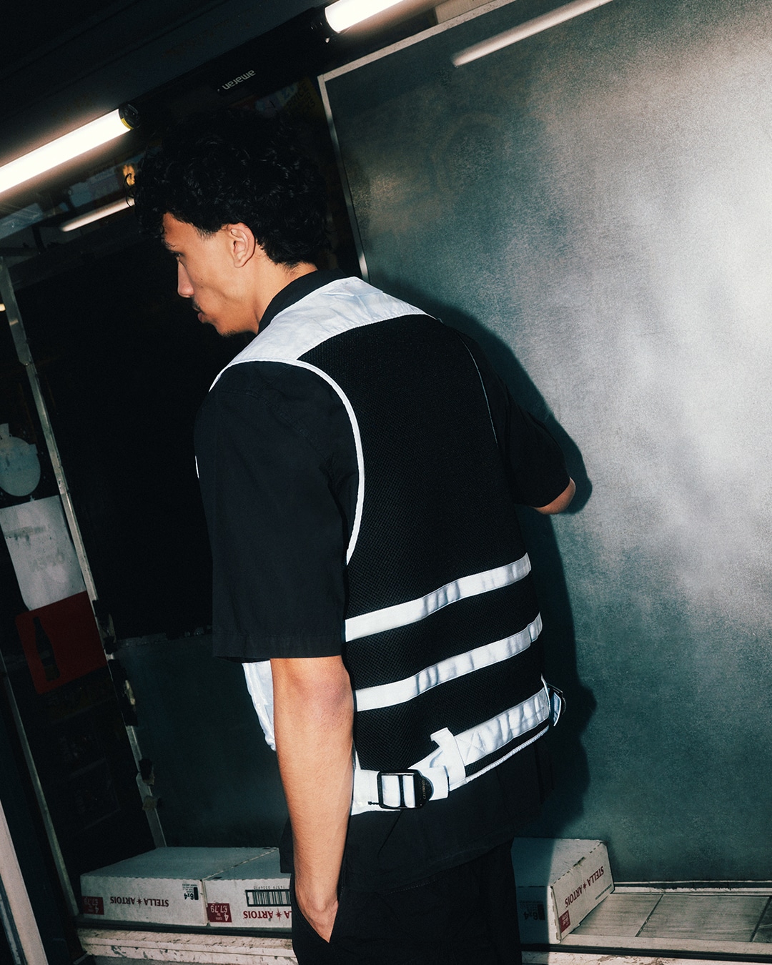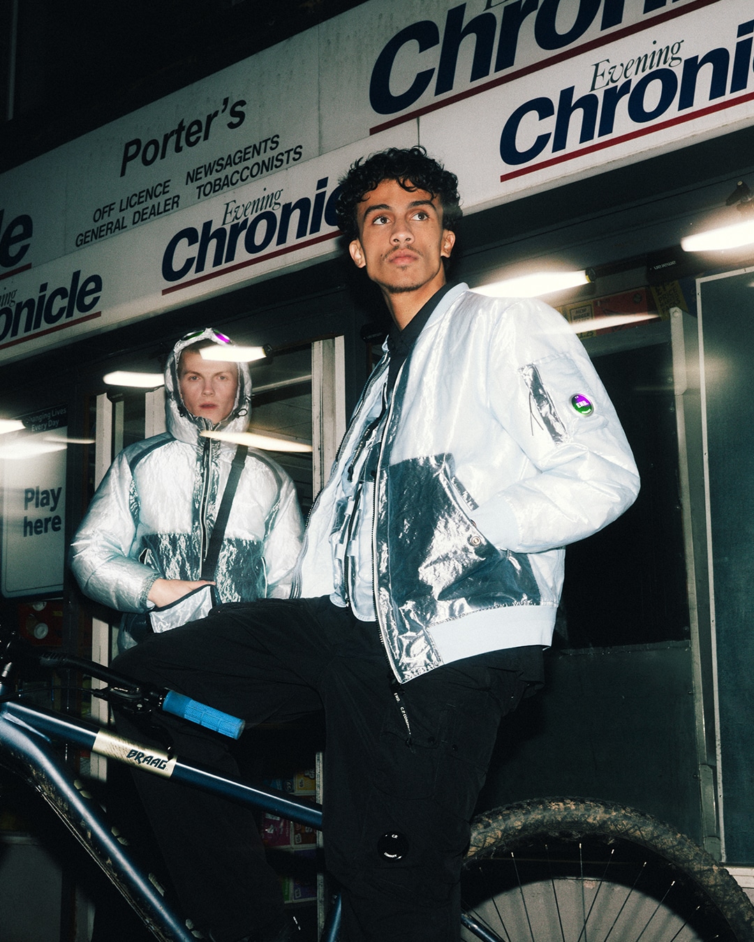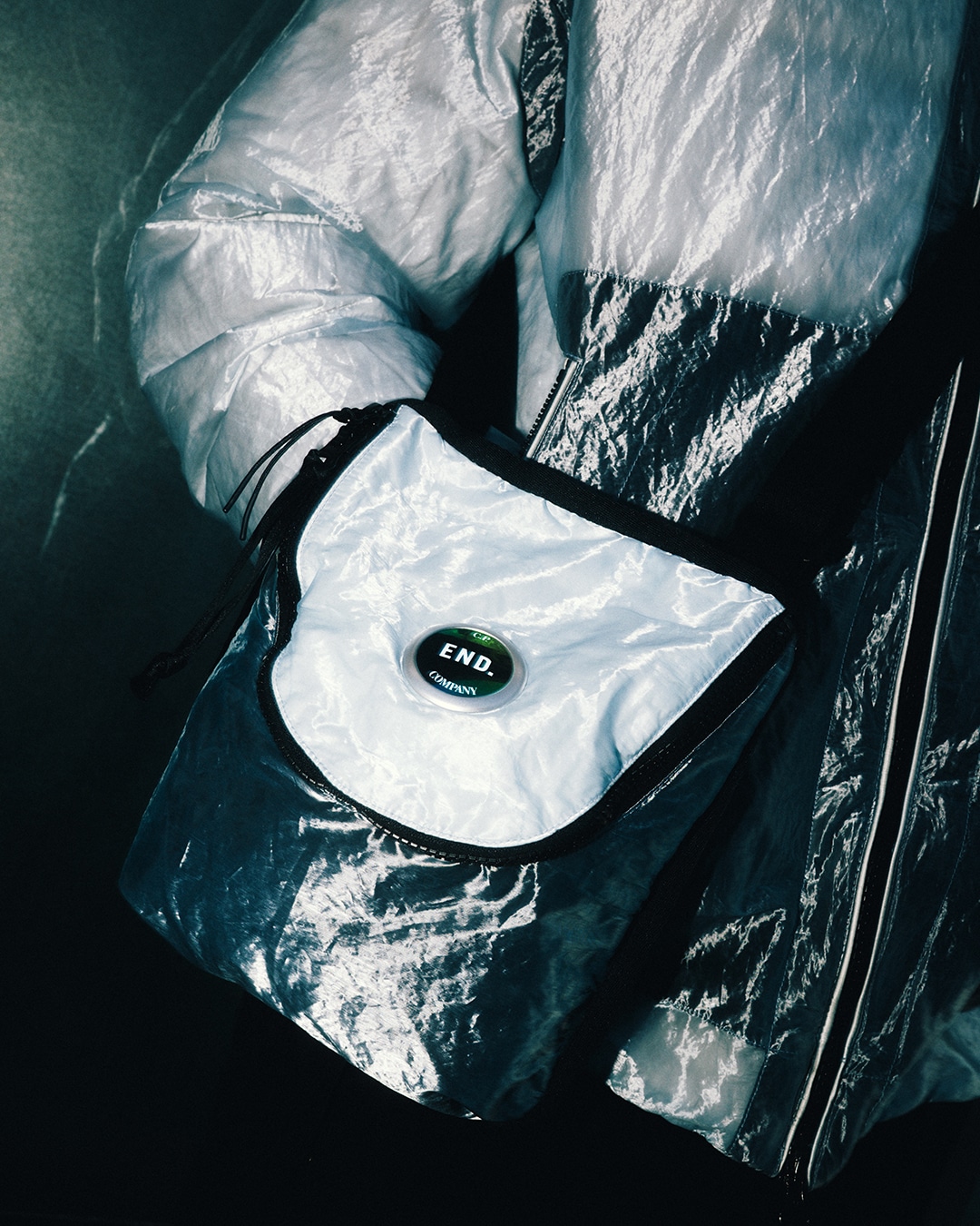 Kapsuła składa się z czterech kultowych sylwetek: Goggle Puffer, Technical Vest, Bomber Jacket i Shoulder Bag. Wszystko w opalizującym, lodowobłękitnym odcieniu, który przywołuje światło neonów rozświetlających miejskie zakamarki. Największą gwiazdą jest nowa tkanina Kan-D – półprzezroczysty nylon o błyszczącym, celofanowym wykończeniu, który odsłania wewnętrzną konstrukcję ubrań i celebruje kunszt ich wykonania.