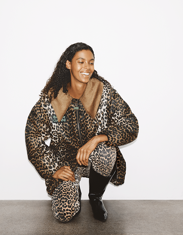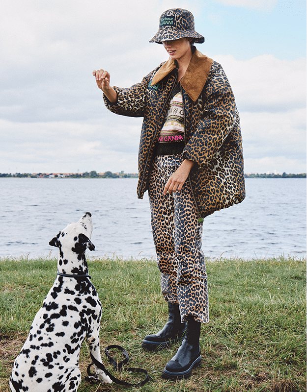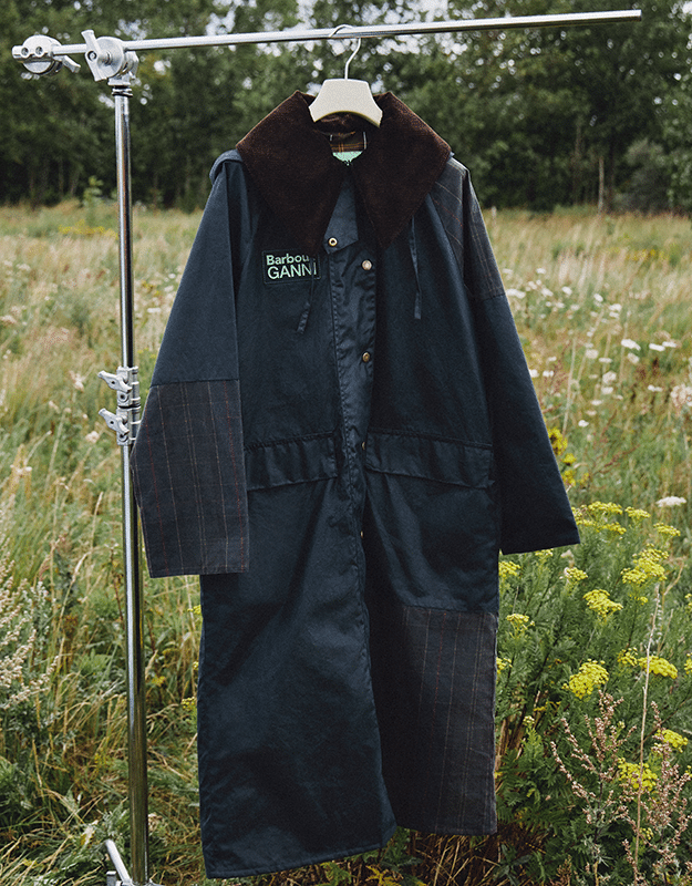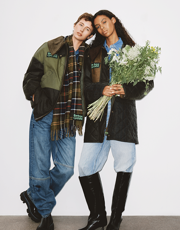 Wielbiciele Barboura docenią, że klasyka została przerobiona w nowoczesny sposób, dzięki inspiracji ze wspólnot South Shields i Kopenhagi. Trzy modele płaszczy charakteryzują się pikowanymi wykończeniami, tkaninowymi panelami i dużymi kołnierzami z miękkiego materiału. Do tego dołączają nadmuchane bombery ozdobione realistycznym wzorem w panterkę. Krótkie kurtki woskowane w zieleni i brązie z wodoodpornymi materiałami oraz tonalnymi znacznikami współpracy to kolejne propozycje. Aby dodać szlachetności całości, GANNI i Barbour wprowadzają też do kolekcji dwuczłonową serię szali w kratkę, co jest nowością dla tego duetu projektantów.