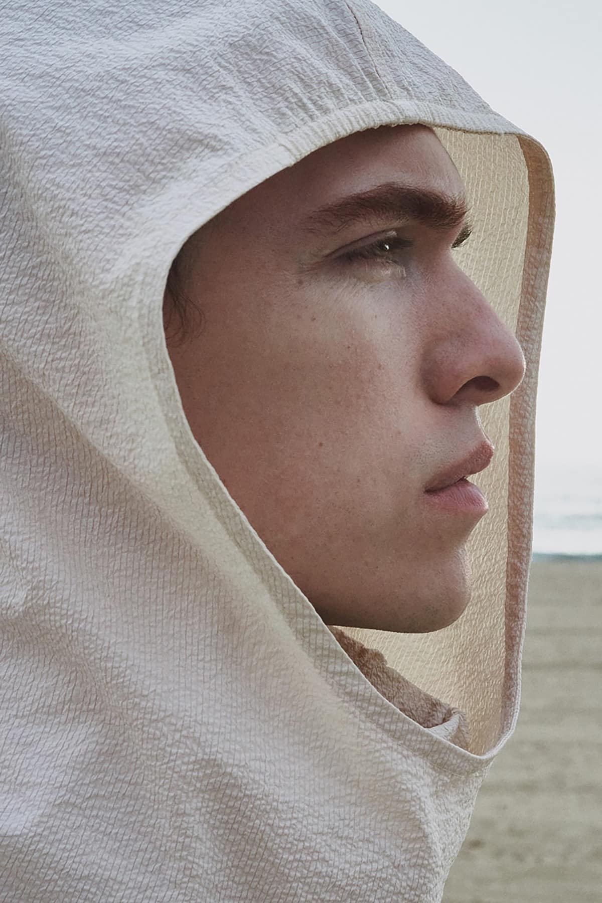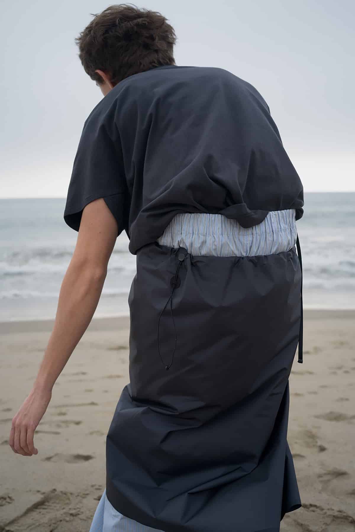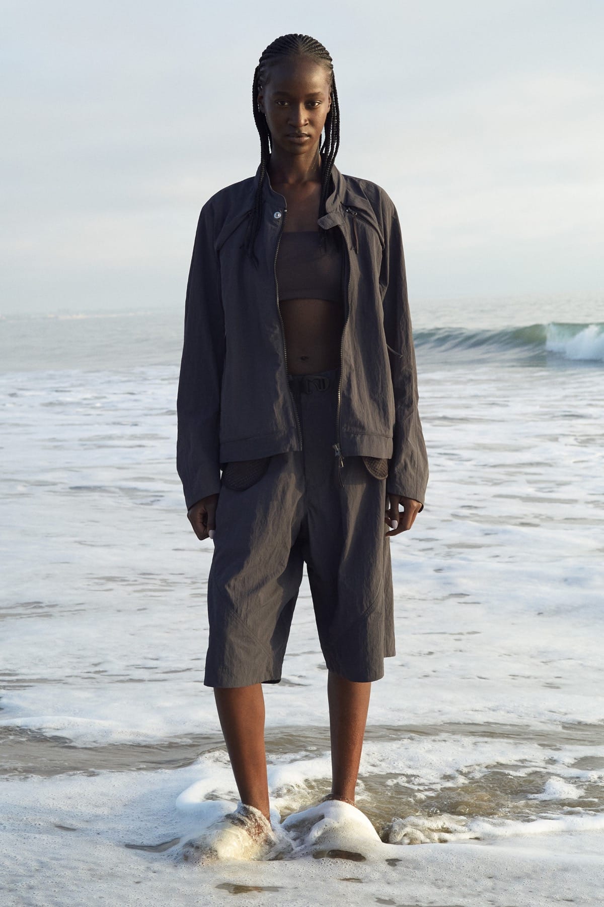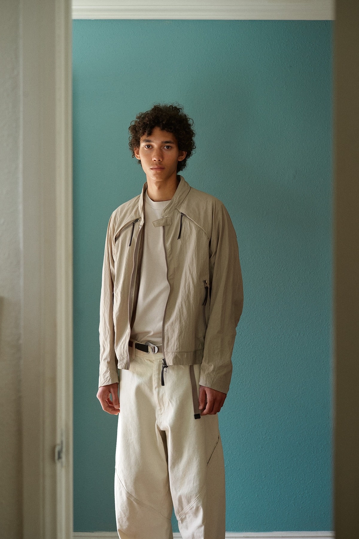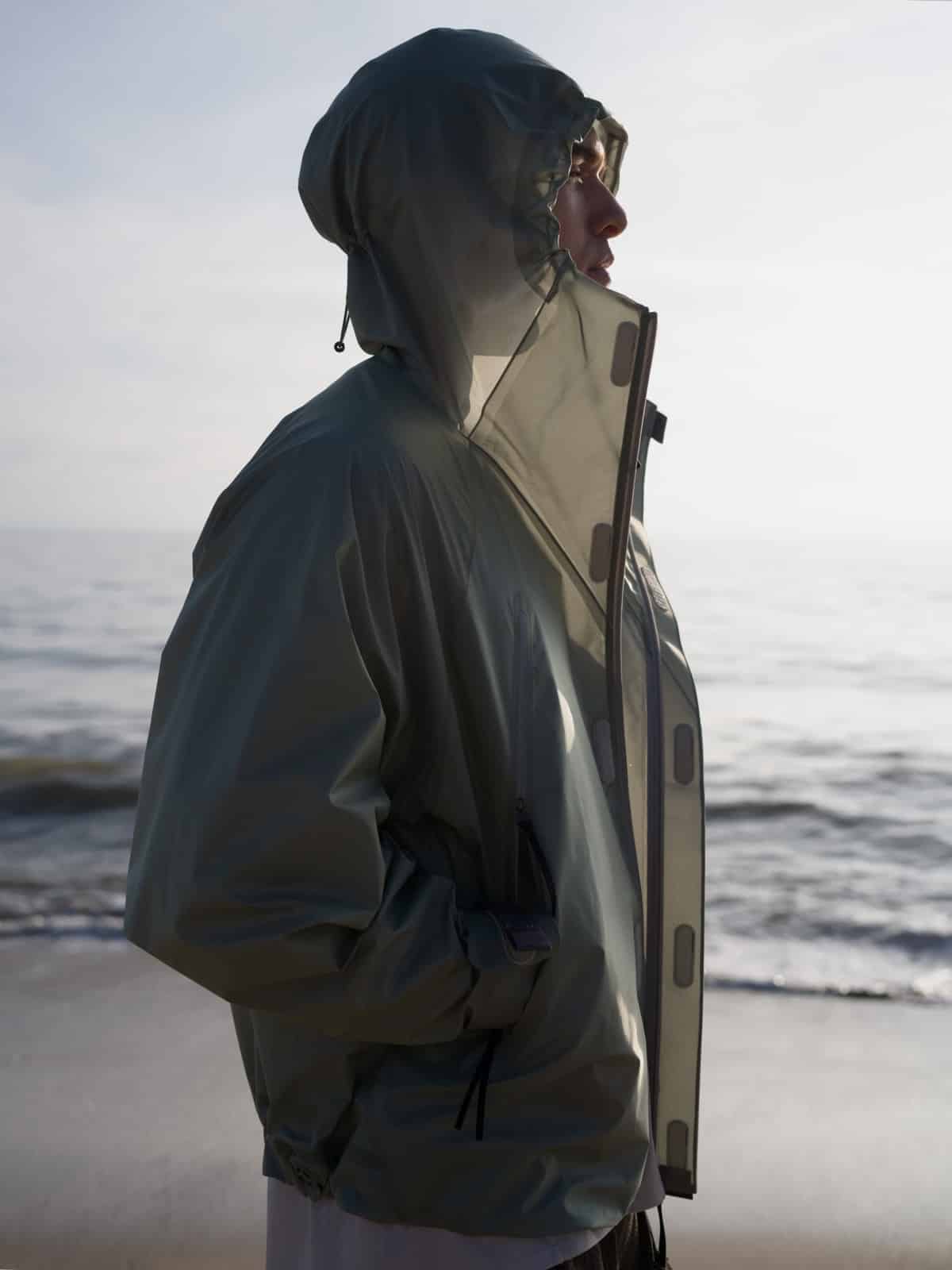 Kolekcja wychodzi z zakładów w Toyamie. Tam prototypy stają się gotowymi sylwetkami – precyzyjnymi, lekkimi i przemyślanymi w każdym detalu. Trójwarstwowa kurtka przeciwdeszczowa z ripstop 10-denier jest niemal przezroczysta. Laserowe wentylacje ukryte w szwach dają czystą linię bez kompromisów funkcjonalnych.