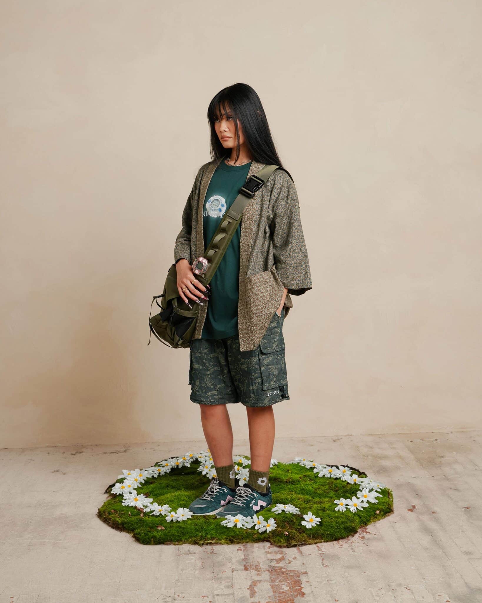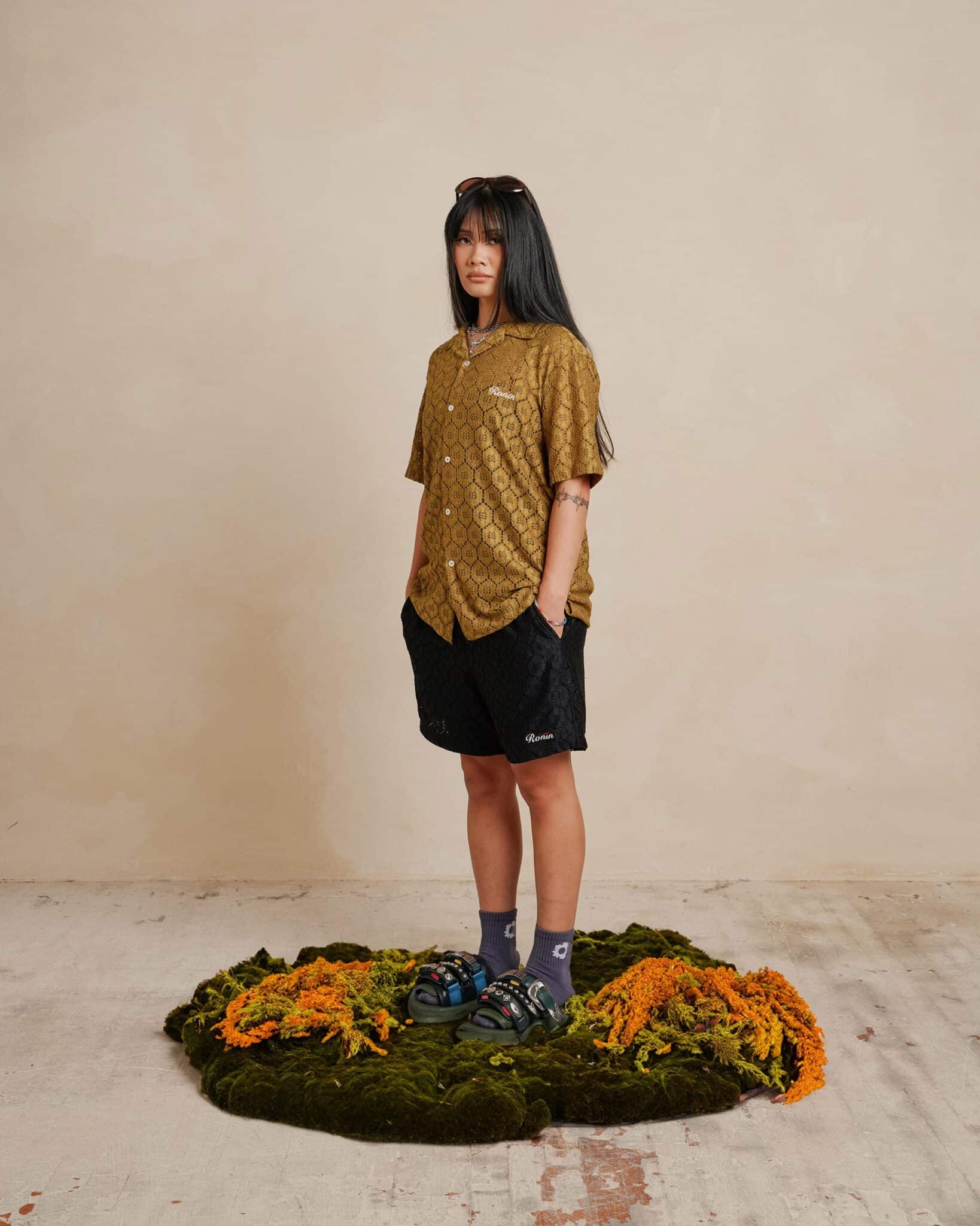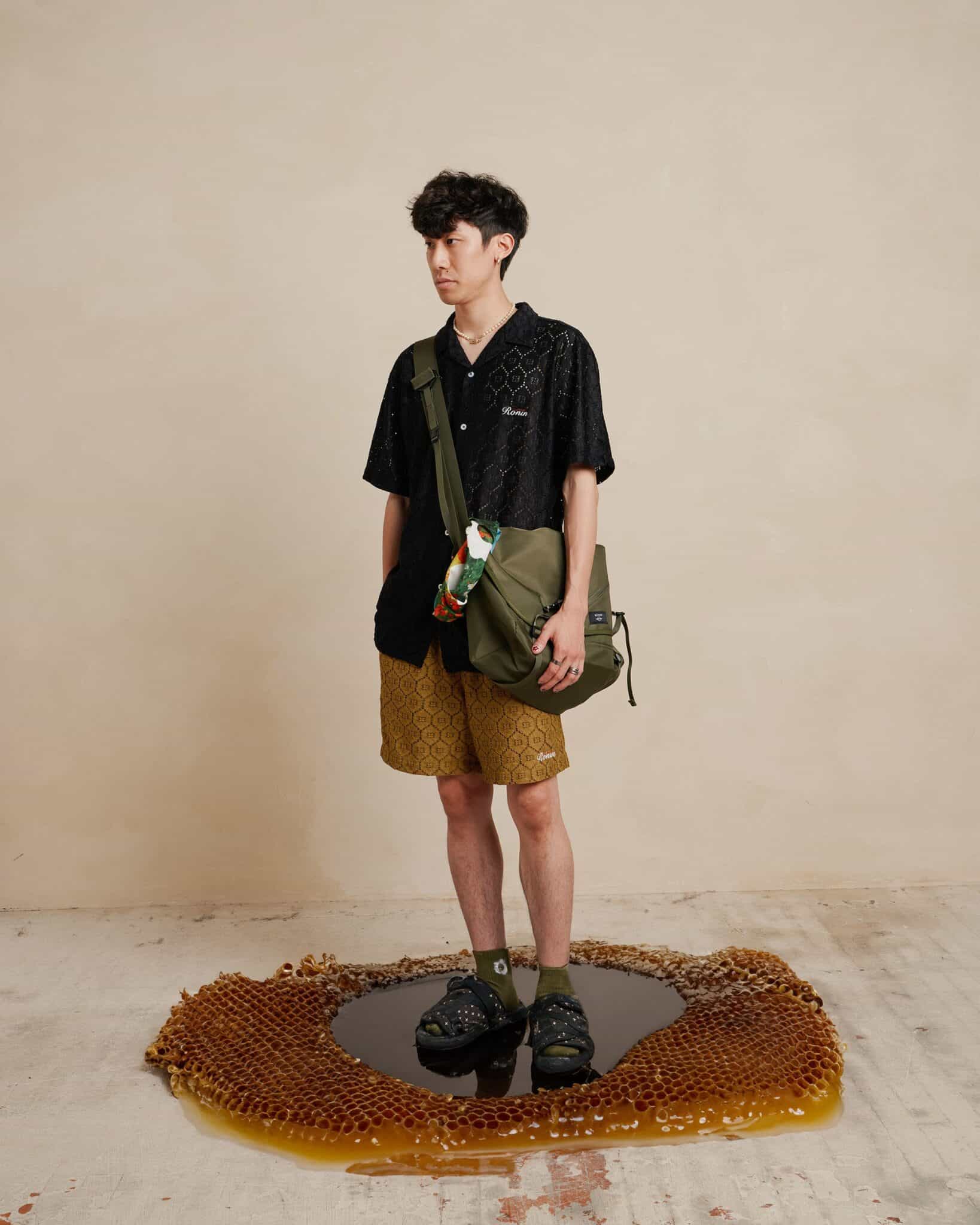 Co do samej kolekcji, to pośród nowości znajdziecie między innymi szorty i spasowane do nich koszule na krótki rękaw. Obie propozycje są pokryte wzorem nawiązującym do plastra miodu oraz w opcji drugiej – wzór imituje płatki kwiatów. Tuż obok zobaczymy koszule ze sztruksu oraz kilka t-shirtów i szortów, które mogą kojarzyć się z konsolami i gamingiem. Do tego dochodzą jeszcze spodnie bojówki, zestaw czapek oraz torby.