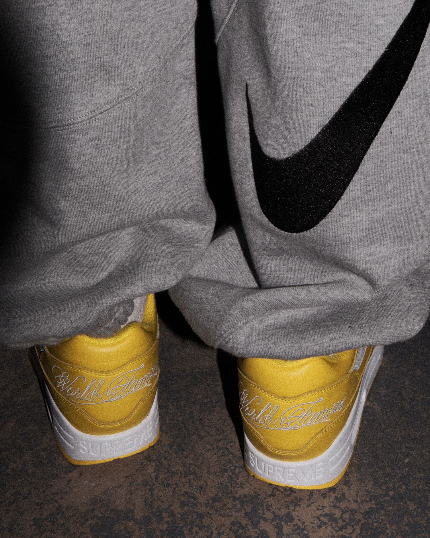 Air Max 1 od Supreme to hołd dla klasyki, wzbogacony o dobrej jakości skórę oraz charakterystyczne akcenty marki. Każdy z czterech wariantów kolorystycznych (biel, czerń, żółty i fiolet) posiada skórzany Swoosh z tłoczonym wzorem wężowej skóry oraz haftowany napis „World Famous” na pięcie. Na języku dumnie widnieje rok założenia Supreme – 1994 – oraz ikoniczne logo w czerwonym prostokącie.