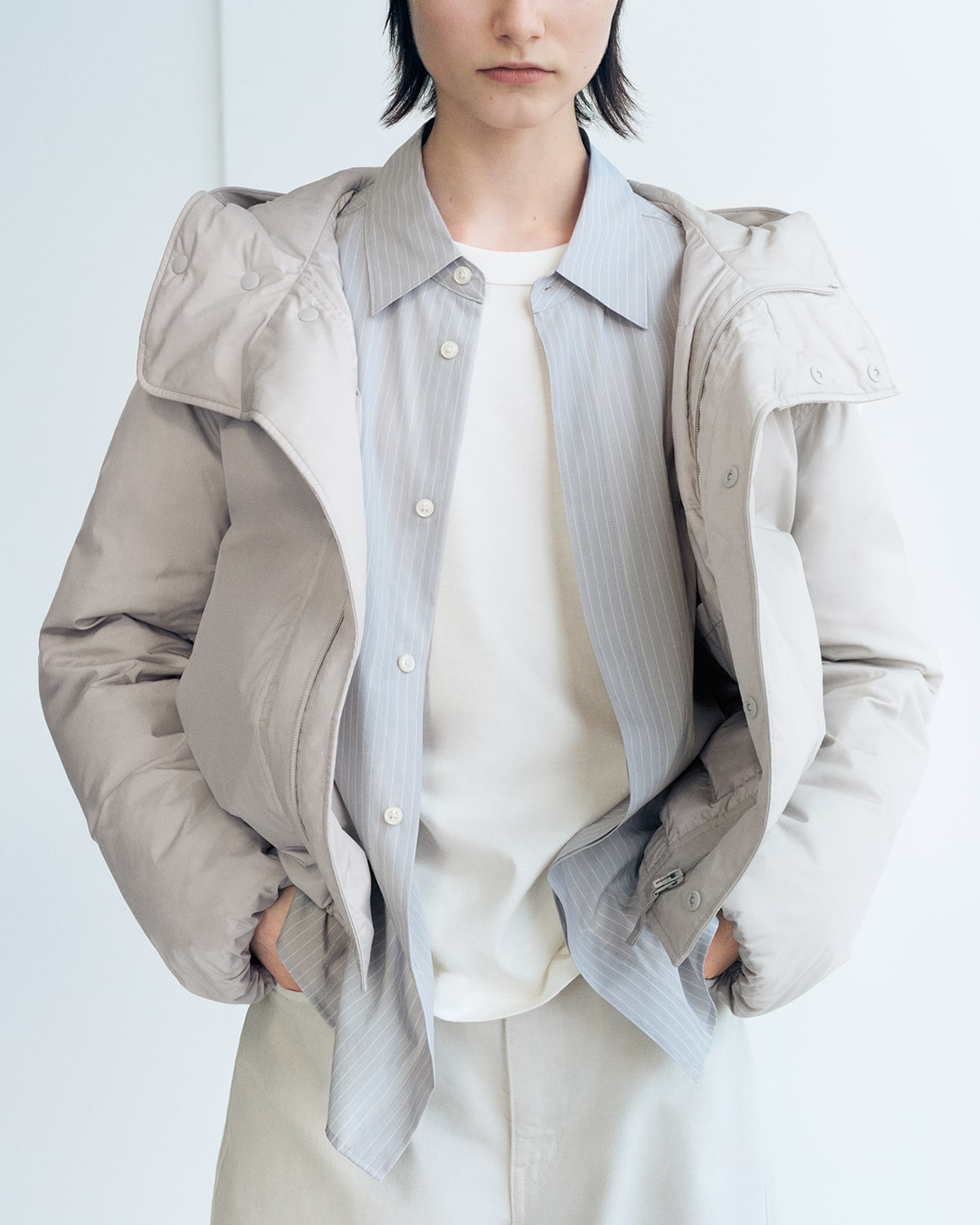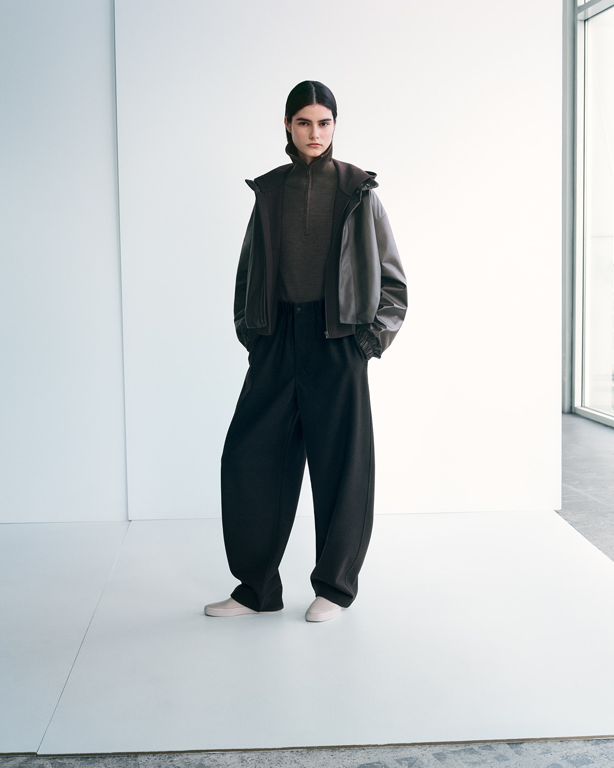 Zespół projektowy Christophe’a Lemaire’a stawia na „Future Layers” – warstwowe stylizacje z merino, crispinylonu i innowacyjnego PUFFTECH, który gwarantuje lekkość i ciepło. Inspiracją stał się klimat Morza Północnego, a paleta barw to głębokie odcienie błękitu, bazylii i śliwy.