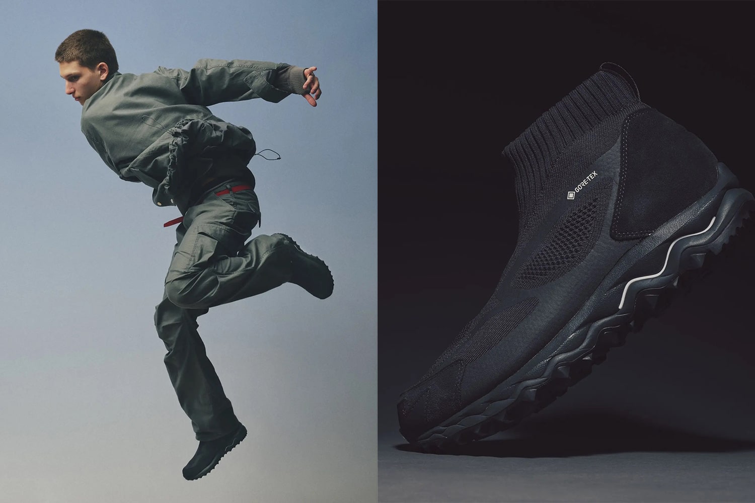 Ten hybrydowy model, zrodzony z niezrealizowanego projektu z 2007 roku, łączy technologię trail runningu z miejskim minimalizmem. W wersji “Ink Black” czerń nabiera głębi — to nie matowa czerń, lecz subtelny „sumi-black”, który eksponuje różnice w fakturach materiałów: knit, zamsz i gumę. Cholewka z GORE-TEX gwarantuje wodoodporność i komfort, a podeszwa MICHELIN zapewnia przyczepność na każdym podłożu — od miejskich ulic po zimowe szlaki.