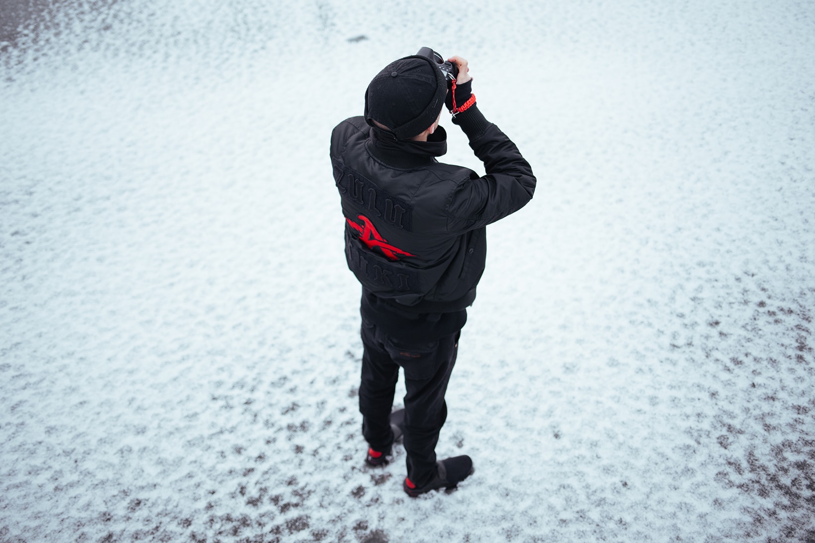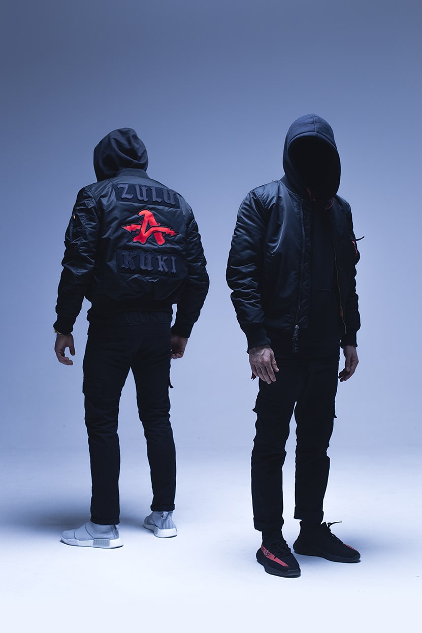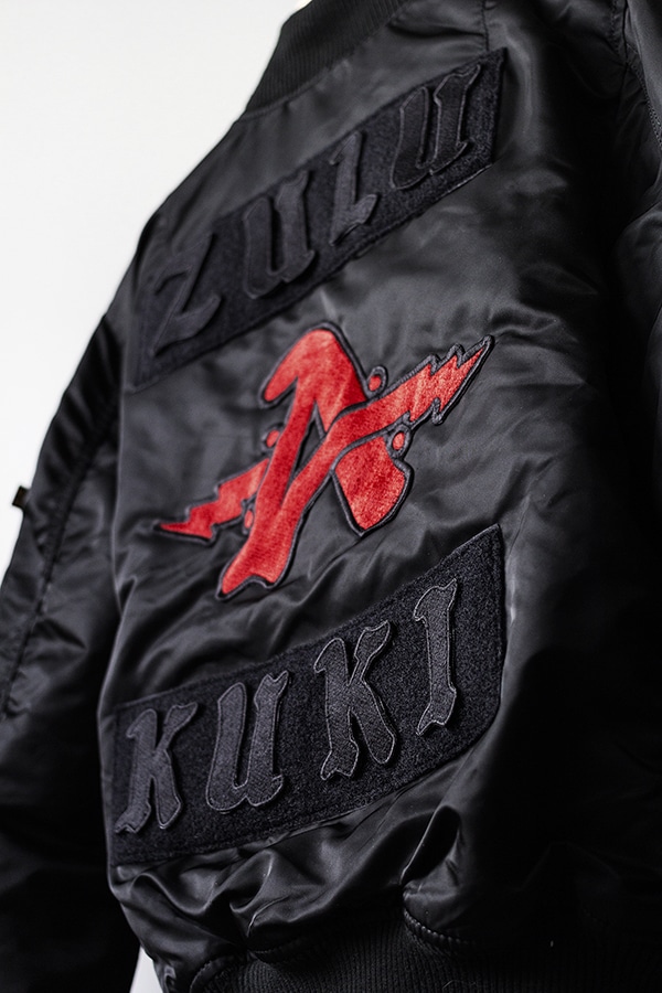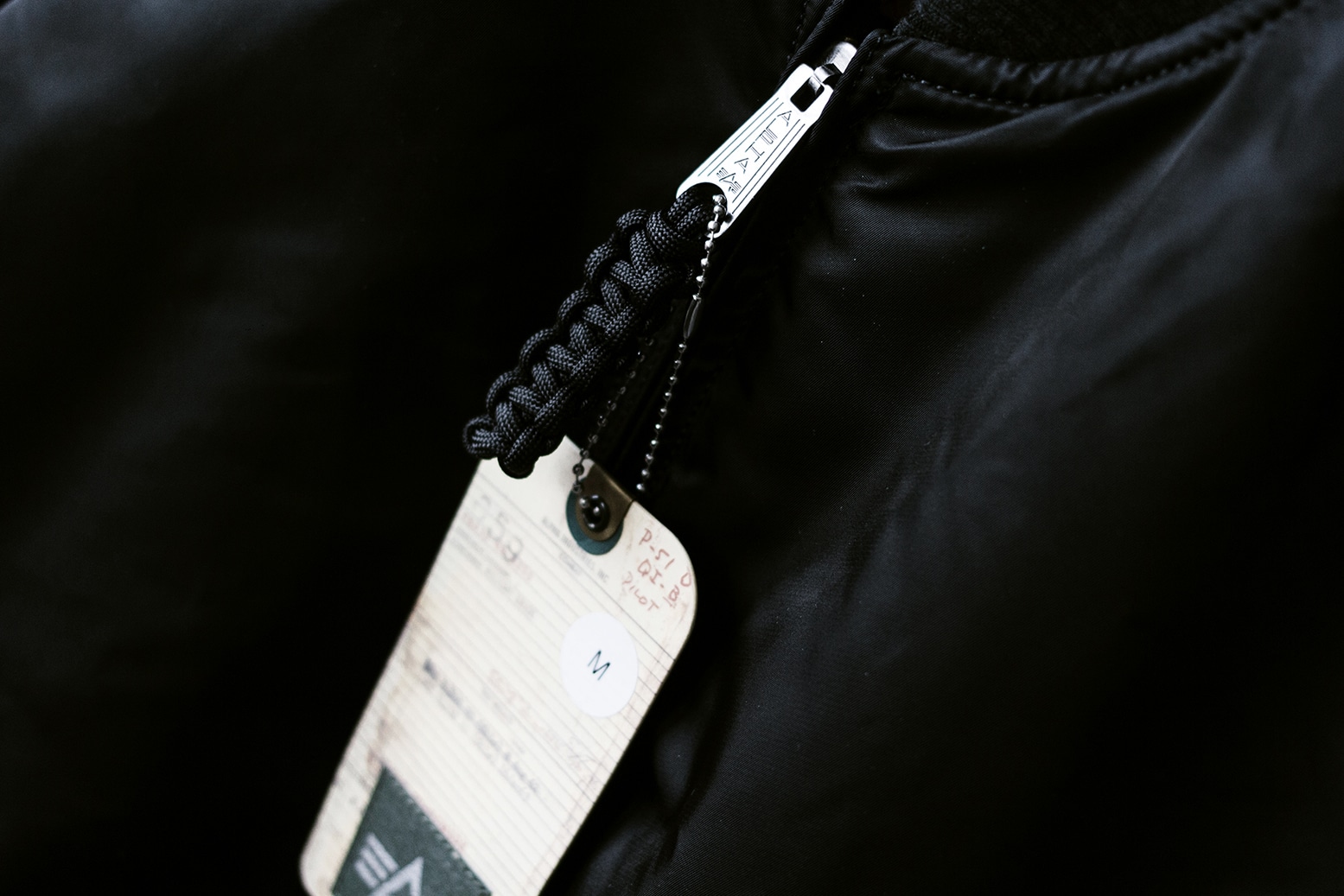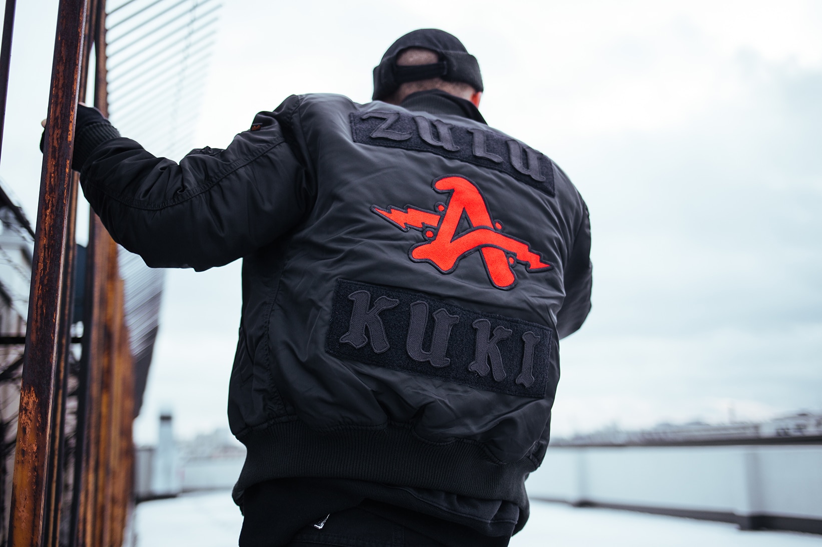 Zulu Kuki postawił na kolor mu bliższy, czyli czerń. Mając odpowiednią bazę mógł zacząć zabawę i szukanie inspiracji. Jak się okazało, długo nie trzeba było się zastanawiać. Główną inspiracją tego projektu jest estetyka młodocianych gangów Nowego Jorku z lat 70-tych, ale także i pionierów kultury Hip Hop. Dlatego więc logo marki Alpha Industries zostało ubrane w oldschoolowy klimat rodem z ulicznych bitw bboy’s czy hiphopowych imprez z DJ’ami pokroju Grandmaster Flasha za deckami. Logo „Flying A” w oldschoolowym wydaniu zostało wyhaftowane i naszyte na plecach. W tym miejscu ogromny props dla Filipa i firmy Splinterhaft za kawał dobrej roboty! Ich dziełem jest także 8 liter, których sumą jest nazwa ZULU KUKI. Flying A oraz dwa łuki wycięte z rzepa, zostały naszyte na plecy kurtki MA-1. Litery zostały podszyte rzepem, dzięki czemu można je przyczepiać i odczepiać od kurtki. Przód kurtki to detale, aczkolwiek nie mniej ważne niż to co dzieje się na plecach. Zarówno suwak zamka błyskawicznego kurtki jak i kieszonki na ramieniu zostały urozmaicone o paracord. Jak mogłoby być inaczej przecież? Z kieszonki za to zniknęła jakże charakterystyczna i kultowa taśma Remove Before Flight, która jest największym znakiem rozpoznawczym Alphy pośród innych bomberek.